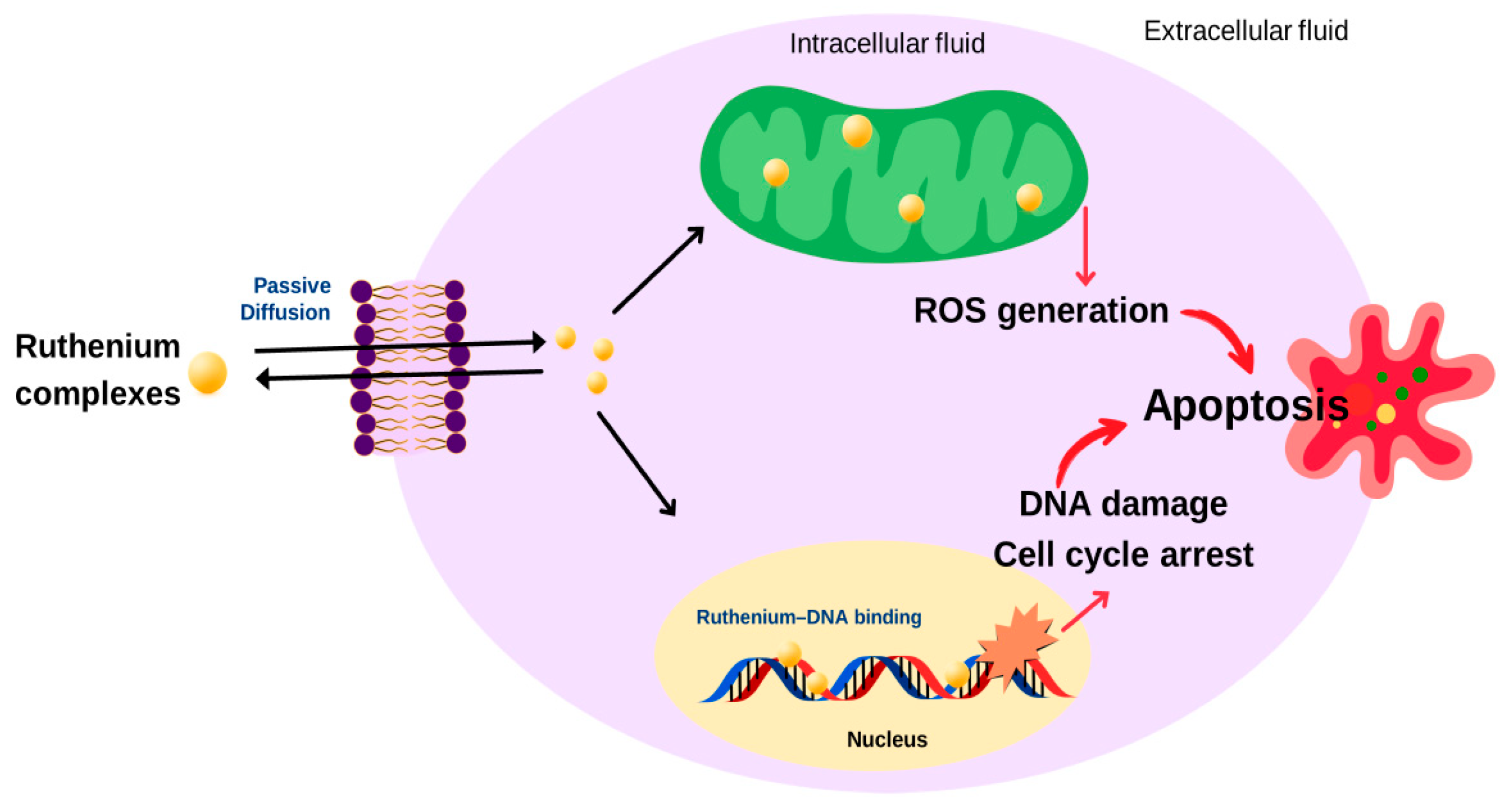 Ruthenium complexesRu(II) complexes inhibit tumor growth and metastasis by entering the nucleus, binding to DNA, inducing DNA damage, and causing cell cycle arrest. Additionally, ruthenium can localize to mitochondria, leading to mitochondrial dysfunction, increased ROS generation, and apoptosis of cancer cells [215]