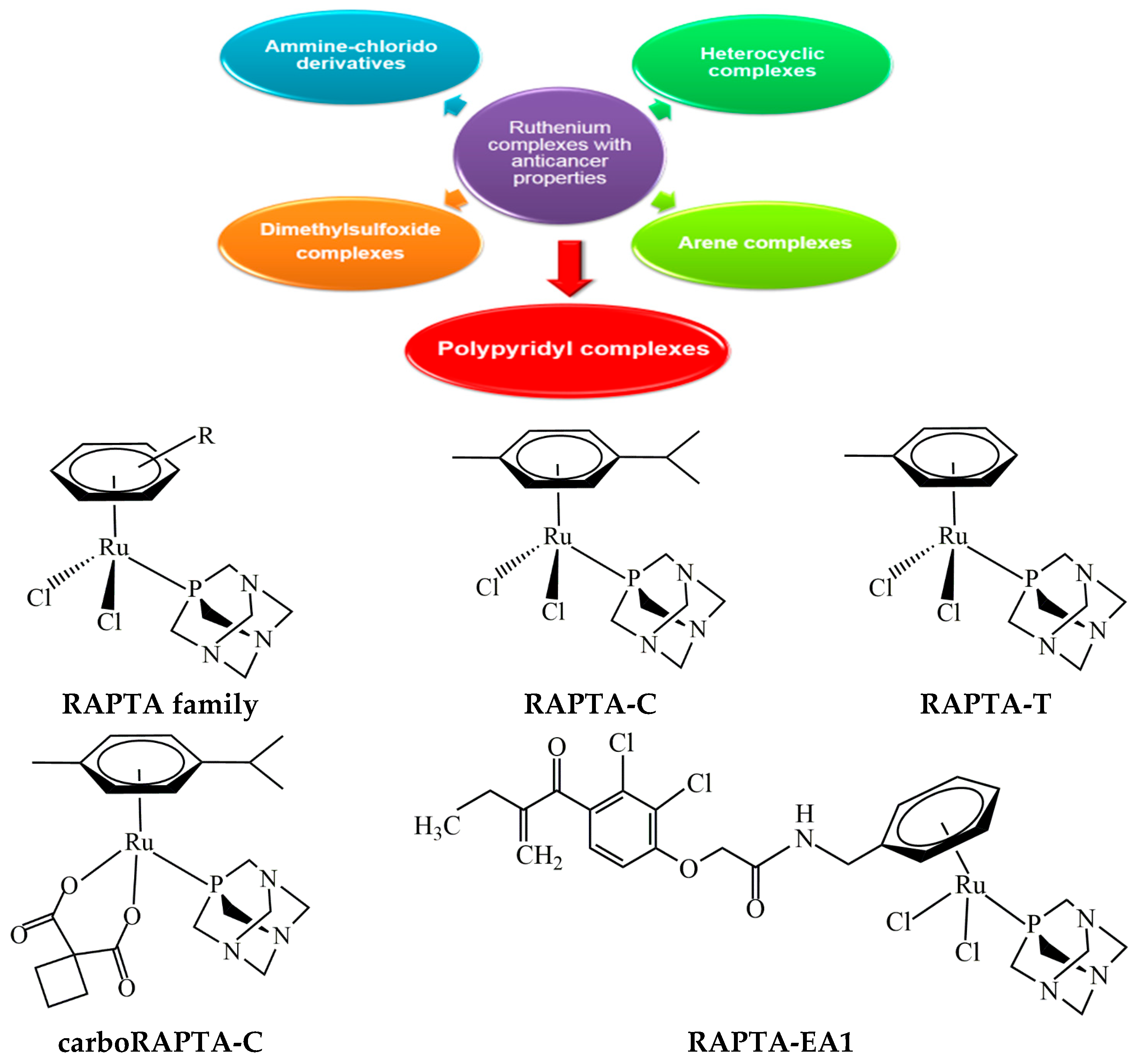 A search for non-platinum metal-based chemotherapeutics has been extensively investigated with recent advances in the development of new anticancer agents [147,148,149,150,151,152,153,154,155,156,157,158,159,160,161,162,163,164,165,166,167,168,169,170,171,172,173,174,175,176]. Among non-platinum-based compounds, a number of ruthenium-centered complexes have received much attention as promising alternatives to conventional anticancer platinum-based drugs. These complexes can form DNA adducts and induce crosslinking, such as effective anticancer platinum compounds, but often with significantly lower general toxicity. The lower toxicity of ruthenium complexes is partly due to a function of the ligands attached to the metal center, and it is believed to be a function of the metal itself. Ruthenium can adopt different oxidation states under physiological conditions [147,148], and the more active Ru(II) oxidation state is promoted in the hypoxic environment of cancer cells, whereas the more inert Ru(III) state is promoted in healthy tissues. Moreover, some ruthenium complexes can mimic iron (Fe) in binding to important carrier proteins such as transferrin [149,150,151,152,153], which is postulated to be a specific delivery mechanism to rapidly dividing cells, including tumor cells, because of their higher iron requirement. Ruthenium complexes appear to exhibit different mechanisms of action compared with platinum compounds (Figure 8). They can interact with DNA and disrupt replication and transcription processes. They also interfere with telomerase activity by binding to G-quadruplex structures of telomeric DNA and inhibit topoisomerases, ultimately inducing programmed cell death. These properties of ruthenium complexes give rise to less toxicity than the approved cisplatin or any other anticancer platinum(II) complexes, and may be able to overcome drug resistance that develops in the current platinum-based treatments. Moreover, they may also target cancer types that are not sensitive to existing drugs. A number of ruthenium complexes with a variety of ligands have been shown to display promising anticancer properties [154,155,156,157,171,172,173,174,175,176,177,178,179,180,181,182,183,184,185]. Several ruthenium complexes have already been shown to exhibit excellent in vivo antitumor activity, and some complexes have even entered clinical trials [150,151,177,178,179,180] (Figure 9, Table 2).