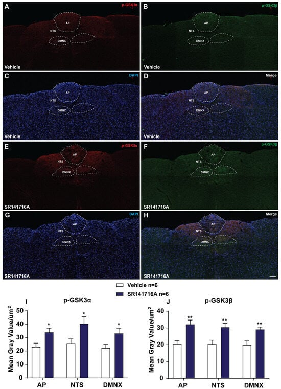 2.2.3. SR141716A Administration Induces GSK-3α/β Phosphorylation in Brainstem DVC