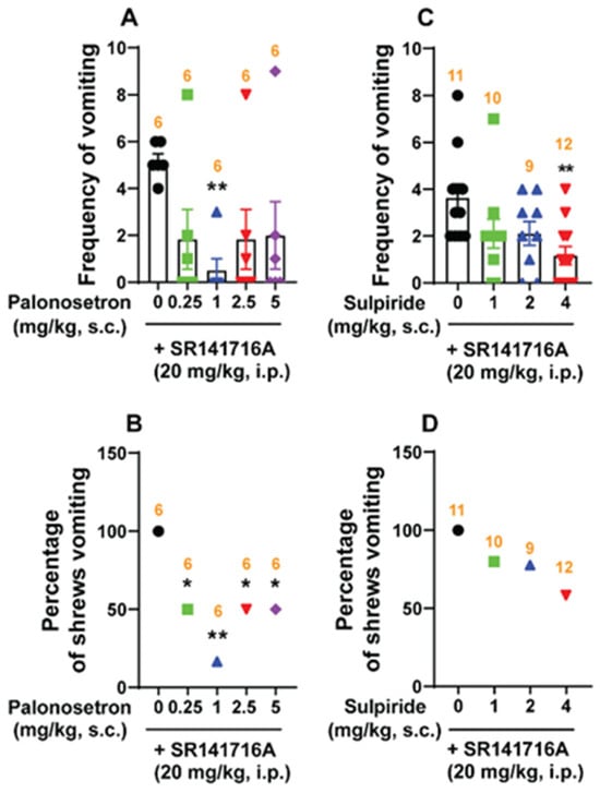 2.5.3. Classical Serotonin 5-HT3- and Dopamine D2/3-Receptor Antagonists Reduce SR141716A-Induced Emesis