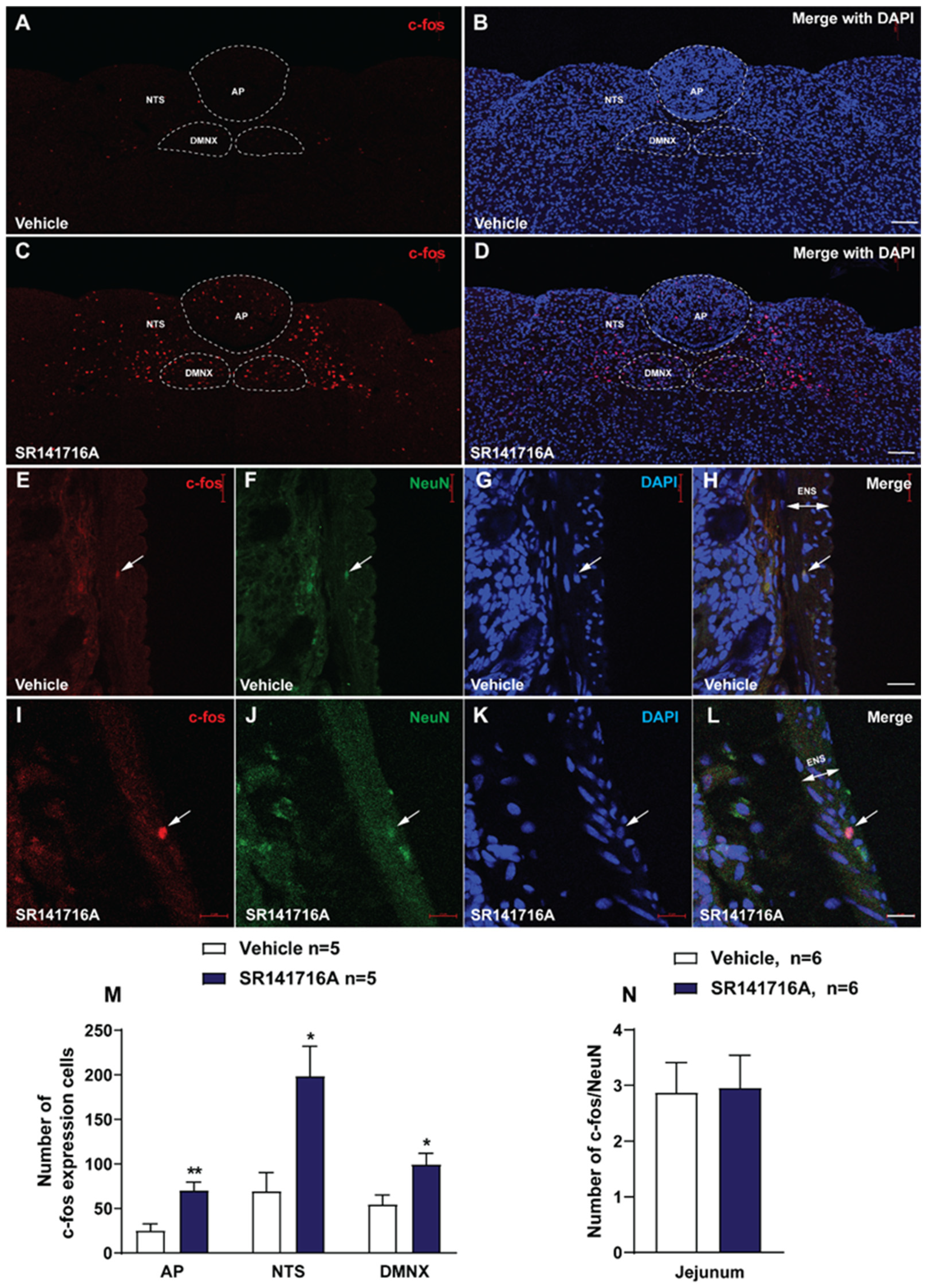 2.2.1. SR141716A Administration Significantly Increased c-fos Expression in the Brainstem DVC Emetic Nuclei