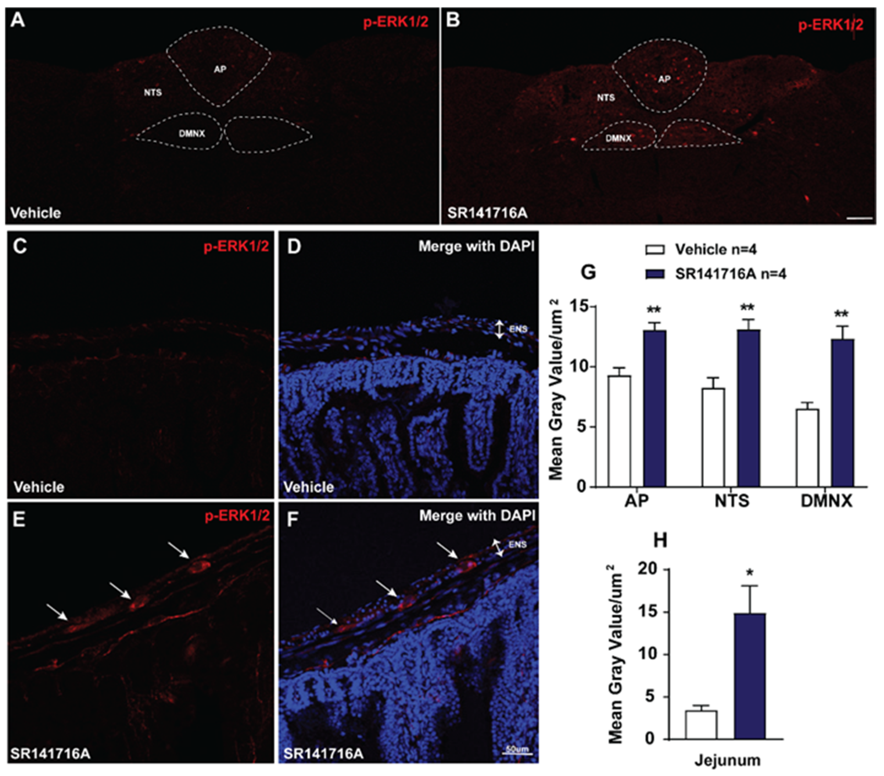 2.2.2. SR141716A Administration Evokes ERK1/2 Phosphorylation in Brainstem DVC and the Jejunum