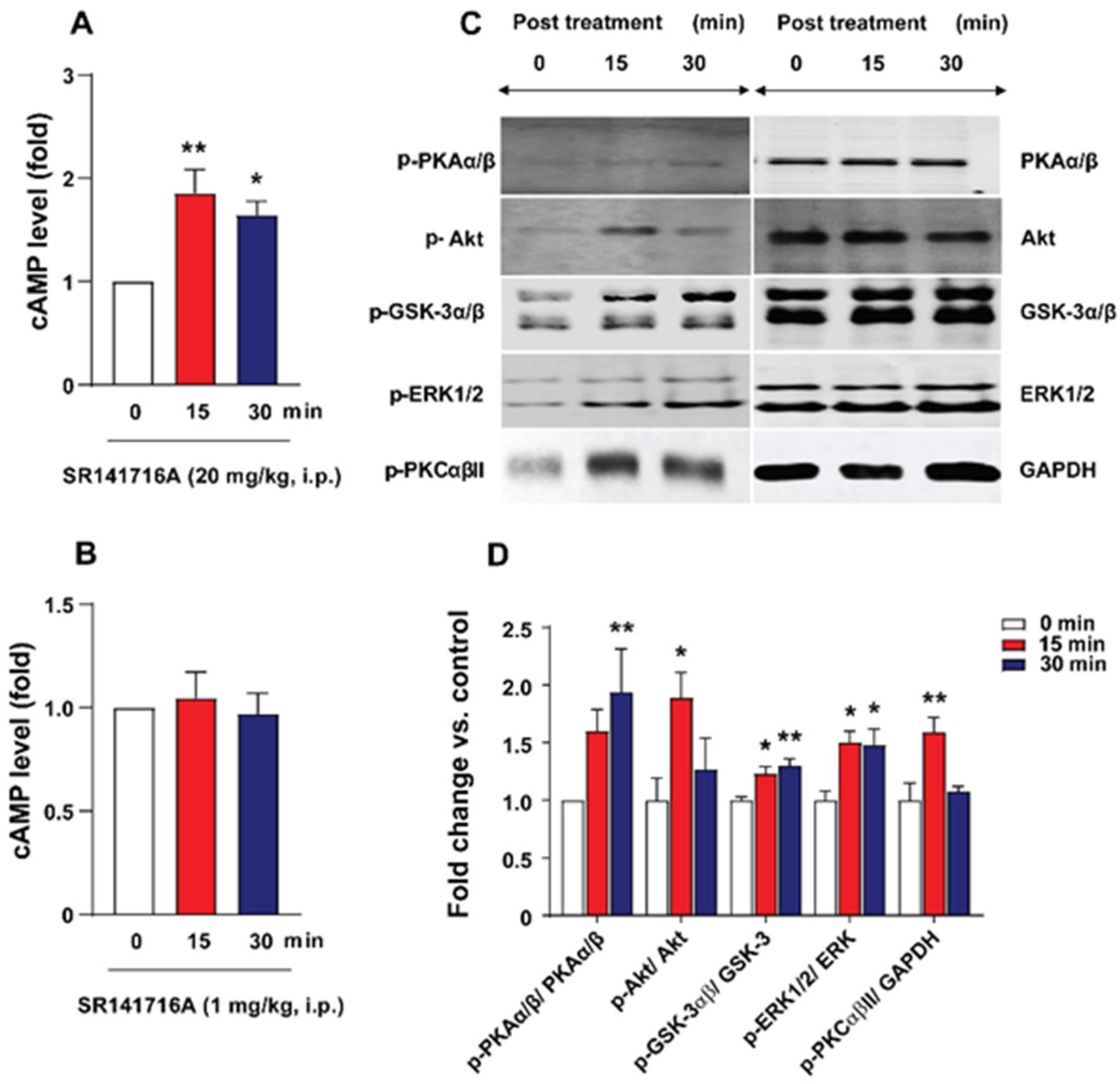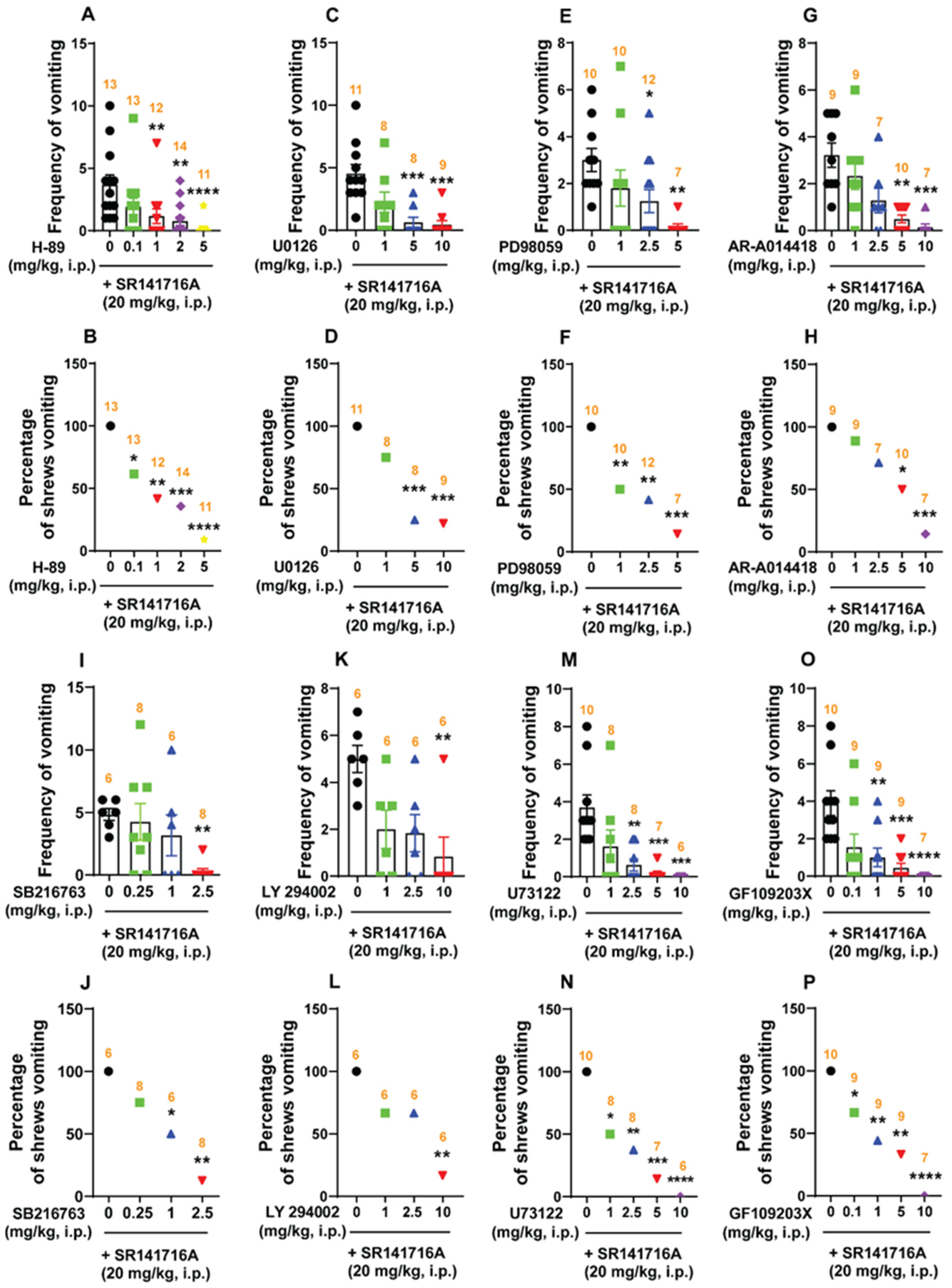 2.5.1. SR141716A (20 mg/kg, i.p.)-Induced Vomiting Involves Emesis-Associated PKA, ERK1/2, GSK-3α/β, PI3K, PLC, and PKCαβII Signals
