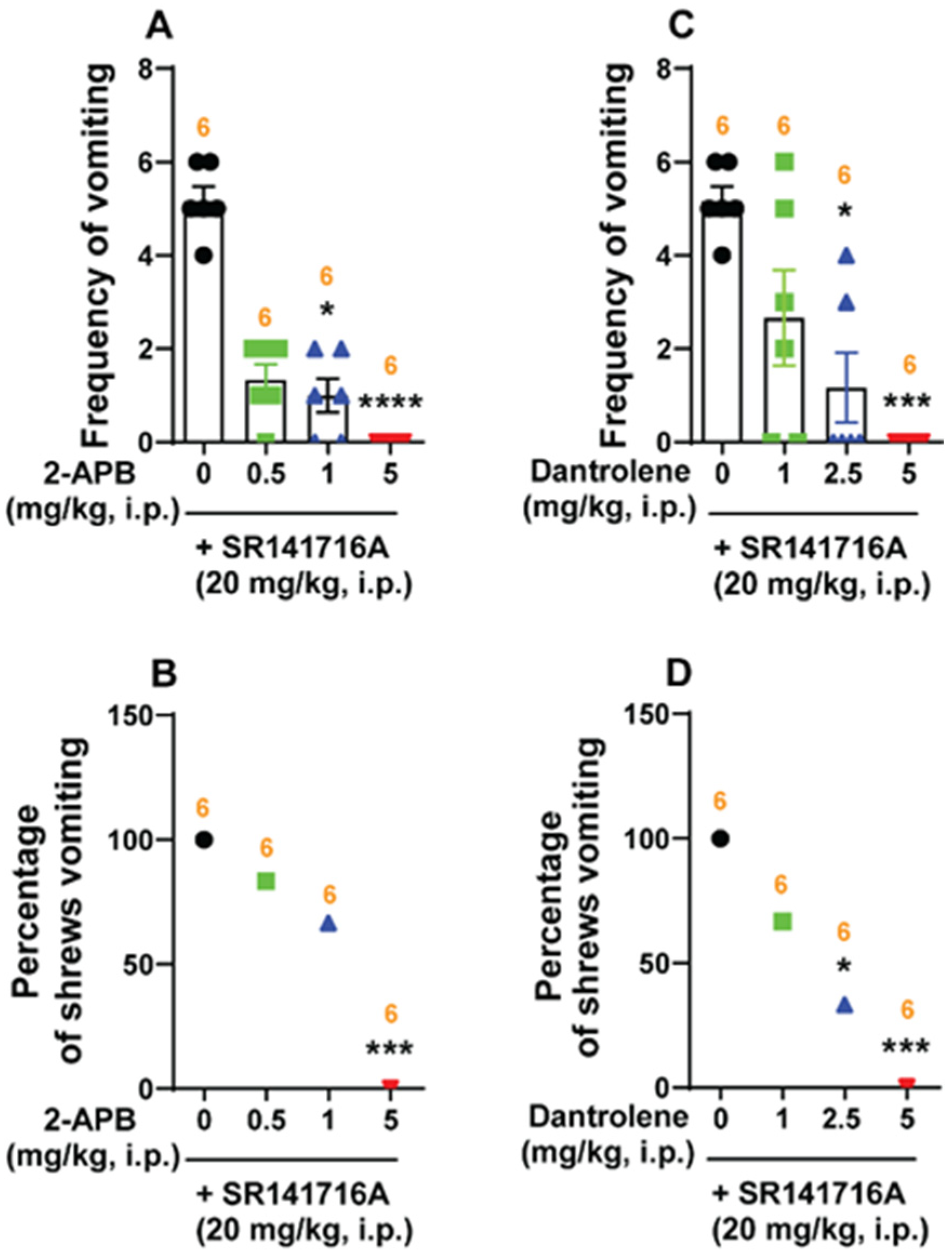 2.5.2. Ca2+ Channel Modulators Reduce SR141716A-Induced Emesis