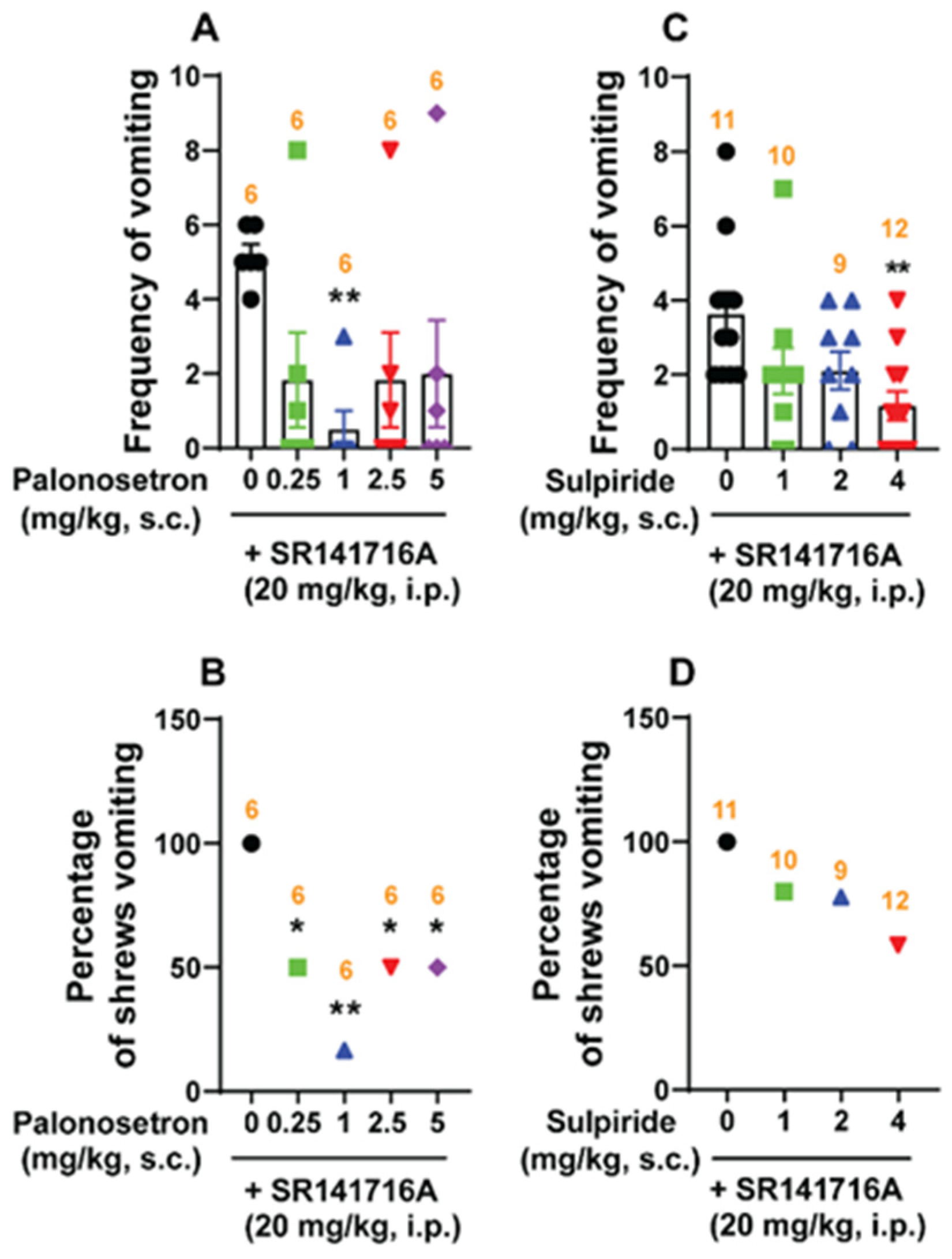 3.4. Effects of Diverse Classical Emetic Receptor Antagonists on SR141716A-Induced Vomiting