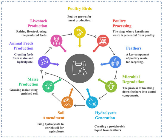 Keratinous waste, an underutilized and recalcitrant renewable resource, poses a significant environmental challenge, offering both opportunities and challenges for sustainable management and economic exploitation. Keratinous residues are excessively generated as byproducts from commercial enterprises such as slaughterhouses, poultry and leather processing facilities [28]. Inadequate handling or disposal of recalcitrant keratinous waste in the environment poses significant challenges due to its slow decomposition, which leads to air, soil, and water pollution [29]. The development of innovative technologies that can efficiently recycle and reintegrate waste into the economy fosters new business models and generates economic benefits in waste management. A typical pathway showing keratinous waste generation, recycling and reintegration into the production chain for a sustainable and circular economy is presented in Figure 1. Biodegradation of keratinous waste is an innovative process in waste-to-value creation, providing an eco-friendly alternative to traditional disposal methods such as incineration and landfilling [30]. This strategy facilitates the conversion of keratin-rich waste into valuable products, including organic fertilizers, animal feed supplements, biofuel feedstocks, aquaculture feed, bioactive compounds, and biomedical materials [2,31]. Various extraction techniques, including enzymatic, microbial, and chemical processes, can be applied to recover keratin from waste sources such as feathers, hair, and wool [2]. Keratin-based products derived from these processes have diverse applications across industries, including agriculture, cosmetics, pharmaceuticals, bioplastics, textiles, and healthcare [1]. By embracing these sustainable practices, the management of keratinous waste can evolve from a linear to a circular economy model, reducing environmental impact while creating potential revenue streams [2,30,32].