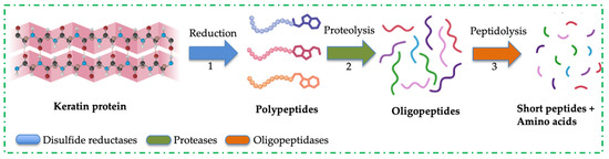 An exhaustive list of literature has documented the degradation of keratinous biomass by a single microbial strain [48,75,76,77,78,79]. This functional activity was primarily linked with the extracellular keratinases produced by these microorganisms. Due to the compact-packing nature of keratin protein, microbes have shown variable degradation of this polymer, generating hydrolysates with different constituents of soluble products. The mechanism by which keratin is disassembled into composite units is under intense research; however, sulfitolysis and proteolysis have been proposed as the processes that lead to the complete disintegration of keratin [80]. Sulfitolysis involves the cleavage of disulfide bonds formed due to the oxidation of sulfhydryl groups (-SH) of two cysteine residues. This process is catalysed by disulfide reductases, reductase-like proteins and other microbial cell-bound sulfites [58,81]. Figure 2 shows the bio-decomposition mechanisms of recalcitrant keratin proteins into soluble products. Disulfide bond reduction can also be facilitated by incubating the protein with reducing agents, such as dithiothreitol, 2-mercaptoethanol, glutathione, among other compounds. The inter-chain and intra-chain breakages weaken keratin protein and expose its peptide bonds to protease attacks, resulting in the complete digestion of keratin. Based on the diverse metabolic capabilities of microbial strains, researchers have analysed the keratinous biomass fermentation medium to understand the microbes’ proteolytic enzyme profile during keratin metabolism [9,82]. These studies identified the presence of keratinolytic enzyme cocktails in cultivation medium with keratinous biomass as the main substrate. For example, the study by Yamamura and colleagues was the earliest work that suggested the synergistic action of two Stenotrophomonas sp. D-1 enzymes with cooperative actions to digest keratin through disulfide bond reduction and proteolytic attack [83]. It was reported that no keratinolytic activity was observed when the enzymes were singly applied. However, when the enzyme cocktails were engaged, keratinolytic activity increased (>50-fold) compared to the protease application alone [83]. A decade later, a poultry farm-associated Stenotrophomonas maltophilia BBE11-1 was recovered and evaluated for keratinolytic potential [84]. Separation techniques and sodium dodecyl sulphate polyacrylamide gel electrophoresis identified three enzymes in the cultivation medium, tagged K1, K2, and K3, with respective molecular weights of 48 kDa, 36 kDa, and 17 kDa. It was discovered that K3 supplementation enhanced the keratinolytic activity of K1 and K2, resulting in significant decomposition of feathers 24 h post-cultivation. It was further established that the synergistic action of K1 and K2 cleared wool cuticle layers without compromising the internal fibres, but the inclusion of K3 in the enzyme cocktails resulted in a noticeable change in the wool structure. The zymography study revealed that K1 and K2 were associated with keratinase activity, while K3 was involved in disulfide bond reduction [84]. In addition, keratinolytic Pseudomonas stutzeri K4 was reported to secrete multiple keratinolytic enzymes, with molecular weights ranging from 26 to 76 kDa, during the digestion of chicken feathers in submerged fermentation [85]. The expression of multiple keratinases by strain K4 caused a significant degradation of chicken feather, liberating 784.2 µg/mL of soluble protein. The crude extract, which contains multiple keratinolytic enzymes, also facilitated the dehairing of goat skin, resulting in complete hair removal after 20 h of incubation [85]. B. licheniformis ER-15 secreted multiple keratinolytic enzymes during growth on goat hair. The enzyme cocktails successfully dehaired animal hide at 48 h without the addition of lime or sulfite, and also caused significant liberation of melanin from depilated hairs after mild-alkali treatment [69]. Indonesian-originated Bacillus sp. MTS was found to disintegrate whole chicken feathers significantly [86]. The analysis of the fermentation medium showed the presence of an enzyme mixture, predominantly keratinase and disulfide reductase. The cooperative action of these enzymes in keratin degradation was tested by using the enzymes singly or in mixture in a reaction flask, and the results indicated that the keratinolytic activity of the enzyme cocktails was greater than that of each enzyme alone, including proteinase K or pure keratinase supplemented with reducing agents [86]. Therefore, the cooperative actions exhibited by the enzyme cocktails profiled so far have revealed the potential mechanisms underlying keratin disassembly. For this reason, the application of MC has become imperative for the effective degradation of keratinous biomass and the generation of protein hydrolysates with improved product profiles.