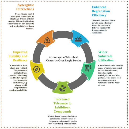 Based on the significant successes recorded by axenic microbes expressing multiple keratinolytic enzymes that act synergistically to digest keratin into soluble protein, MC application has been under intense investigation as an alternative approach to recycling keratinous biomass [16]. Figure 3 presents a summary of the advantages of using MC in keratinous biomass degradation over a single microbial strain. MC are generally categorized into two classes based on how the microbial communities are assembled, and they include natural and artificial [87]. Natural microbial consortia (NMC) are the assembly of geo-microbial functional groups that share specific ecological functions and play essential roles in nutrient cycles. AMC are a collection of wild-type microbial strains from the same or different environmental niches that share desired biological functions [88]. The advantages of AMC include a simpler consortium system, compatibility assessment, knowledge of the metabolic capabilities of the strains, and known optimal process conditions of the consortium members [62,89]. The advancement in synthetic biology and bioengineering has further necessitated the development of microorganisms to express specific traits tailored for controlled applications [90]. To this end, AMC have two notable offshoots classified as synthetic and semi-synthetic microbial consortia. Synthetic MC constitute two or more engineered microbial strains with optimized metabolic capabilities designed to execute specific functions. This system has been reported to possess high performance efficiency due to its shared functional activity, which ensures a reduction in metabolic burden [91]. On the other hand, semi-synthetic MC are constructed using a combination of metabolically engineered and wild-type strains. A semi-synthetic consortium demonstrates a high success rate by leveraging the quality contributions of natural diversity and engineered precision [92].