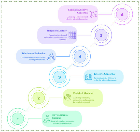 Due to the diversity and complexity of the consortium, an environmental selective pressure undoubtedly occurs during the enrichment process, which enhances the formation of a high-performing microbial consortium for a desired function [18]. However, microbial cheaters with no functional benefits to the consortium may contribute to the complexity of environmental microbial communities. NMC with decreased complexity but enhanced efficiency can lead to an optimized industrial bioprocess. For this reason, the enrichment method and dilution-to-extinction have been employed to create simplified microbial consortia (SMC) of KMCG6, which exhibit excellent keratin degradation capacity and reduced community complexity [18]. The flow chart demonstrating the construction of an efficient SMC is shown in Figure 4. Further study through metagenomic annotation revealed the robust metabolic capabilities of the microbial consortium members [19]. The delineation of metabolic pathways, such as amino acid metabolism, the urea cycle, and disulfide reduction, in the annotated genome of the consortium corroborated the metabolic cooperation required for efficient degradation of keratinous biomass. The researchers highlighted that amino acid utilization for energy requirements and cross-feeding interactions were paramount for maintaining the stability of the consortium [19]. A recent study by Wang and colleagues investigated the dynamics and network of microbial interactions in a consortium enriched with poultry feathers and cultivated at differential temperature conditions [96]. The study revealed that the bacterial species with dominant phyla in all treatment conditions were Firmicutes (56.65%), Actinobacteria (18.13%), Acidobacteria (11.14%) and Proteobacteria (10.35%). The metagenomic studies revealed enzymes such as dipeptidases, aminopeptidases, threonine endopeptidases, metallo-carboxypeptidases, aspartic endopeptidases, and serine endopeptidases coupled with disulfide reductases, confirming the microbial community’s synergism in keratinolysis [96].