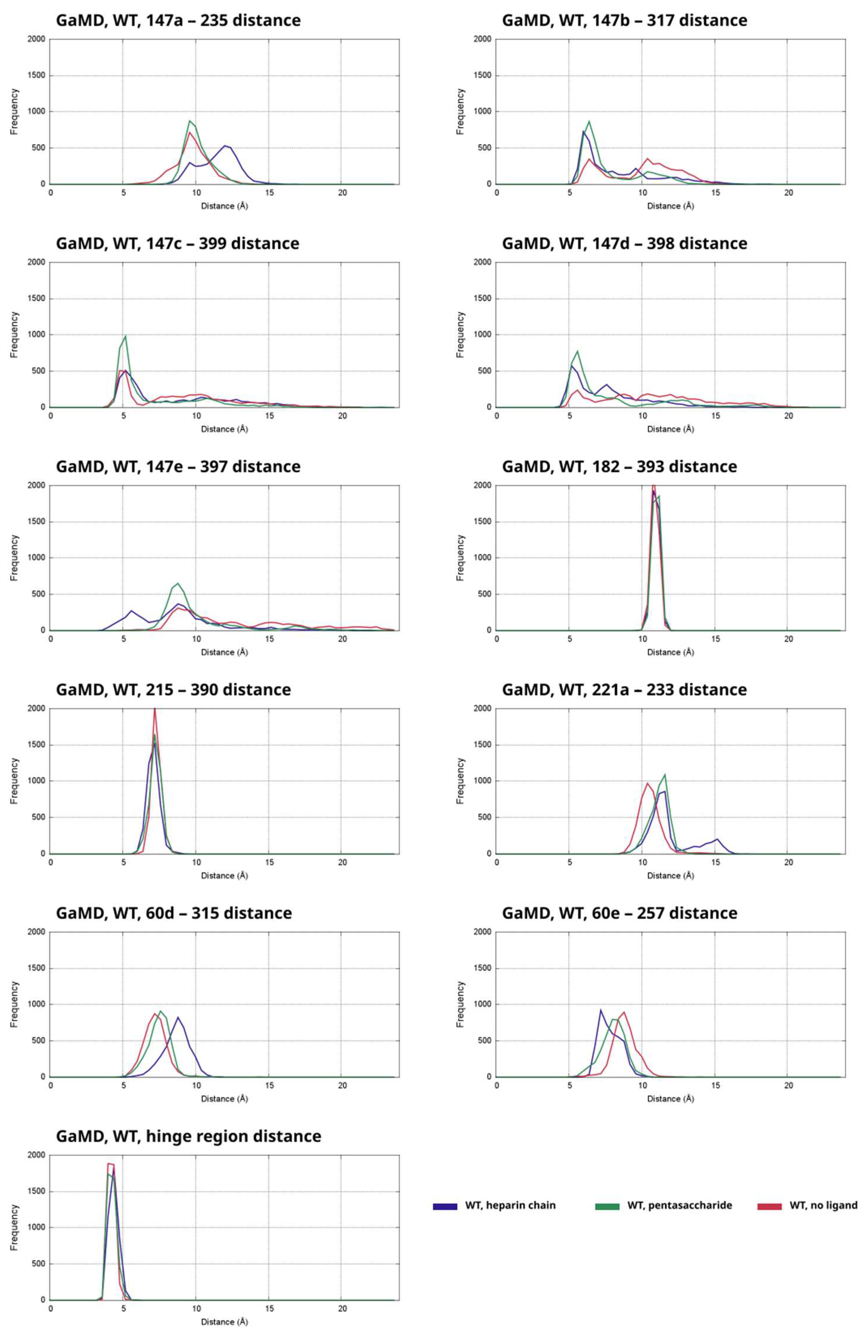 To study the effects of the presence of two types of heparinoid ligand on the exosite interactions, we have performed 500 ns GaMD simulations, four replicas for the three modeled activation states (heparin chain, pentasaccharide and no ligand). From the trajectories we calculated distances for several interacting residue pairs and compared the results to the results for the system with no ligand. The distribution of distances was depicted as histograms. For all distances, we have plotted the combined data from the four independent simulations for each activation state (heparin chain, pentasaccharide and no ligand) as separate histograms on a single plot. The frequency values correspond to the number of frames in one of the “bins” of the histogram. The results for the systems based on the 1TB6 X-ray structure with wild type AT are shown in