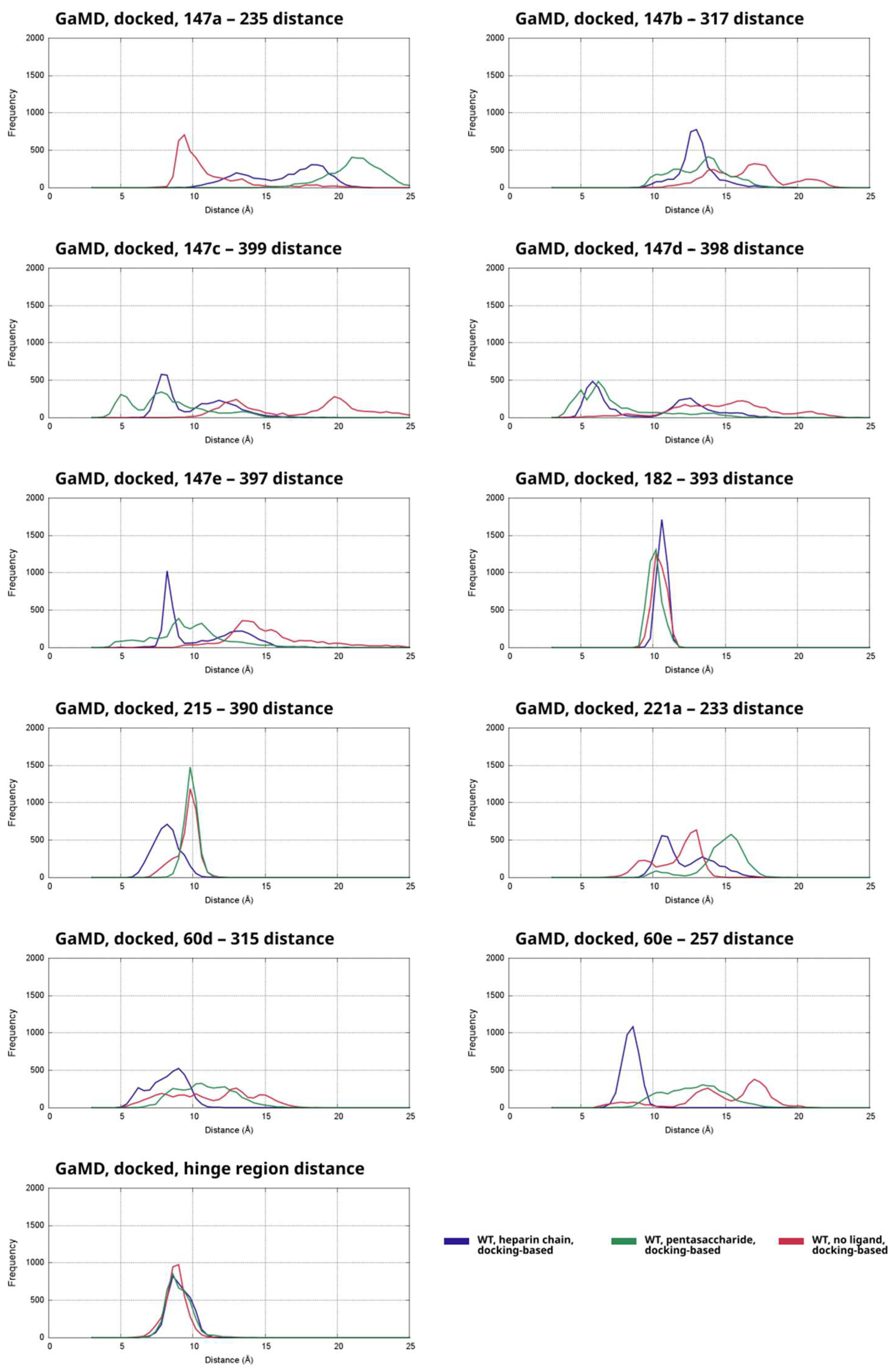 Figure 3) were closer to the optimal value in the complexes with the longer heparinoid compared to the related pentasaccharide-containing and ligand-free systems. It was closer to the corresponding distances in the histograms of X-ray diffraction-based simulations as well. In contrast, the distances between the important Trp147a amino acid and its binding site were far higher than optimal in nearly all analyzed frames. This suggests that the presence of a heparin chain forming a bridge has a limited stabilizing effect on the complex.