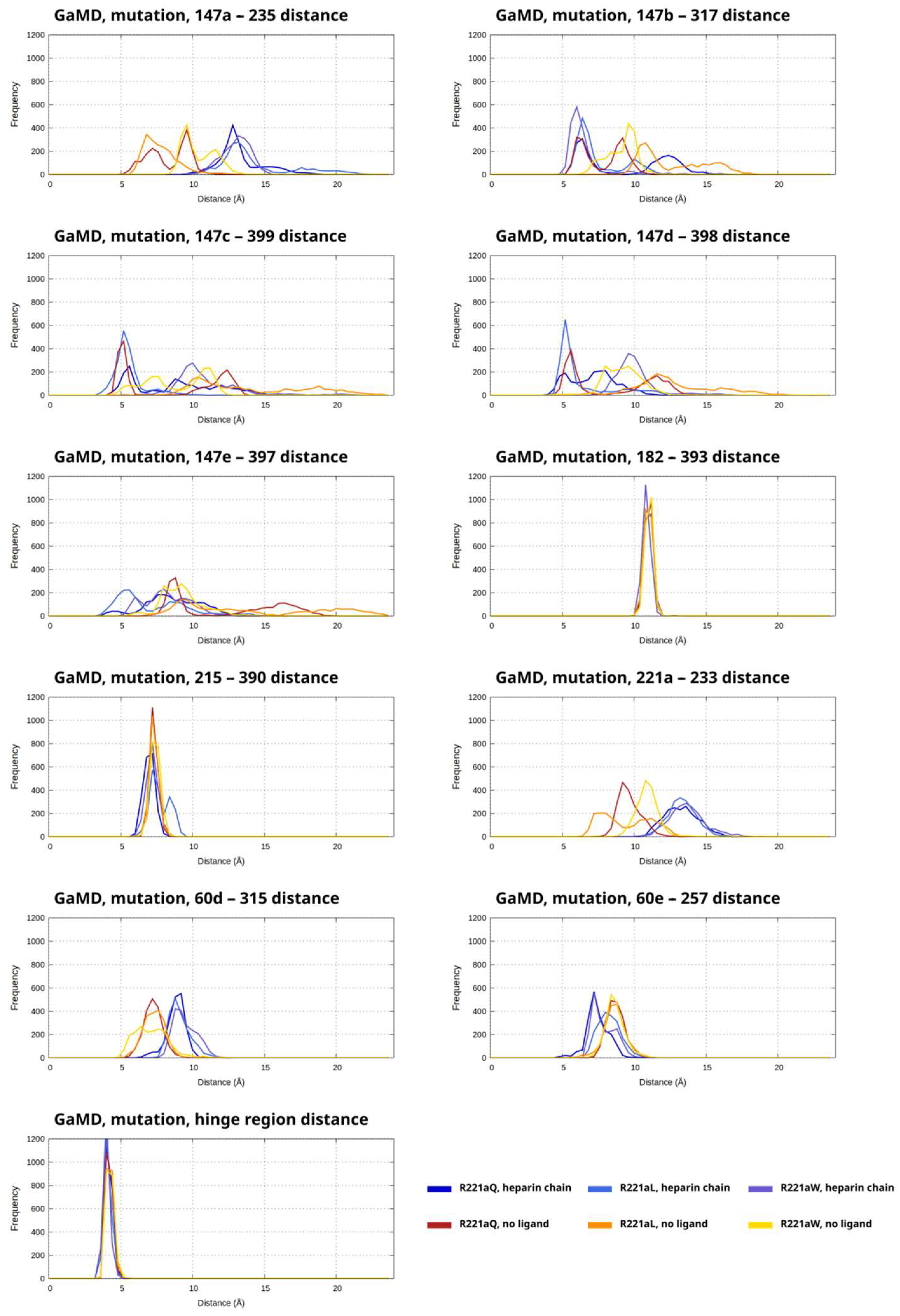 The plots for each analyzed distance parameters contain histograms for the three mutations in the R221a position and the two simulated activation states (heparin chain, no ligand) separately (six histograms in total in one plot) (