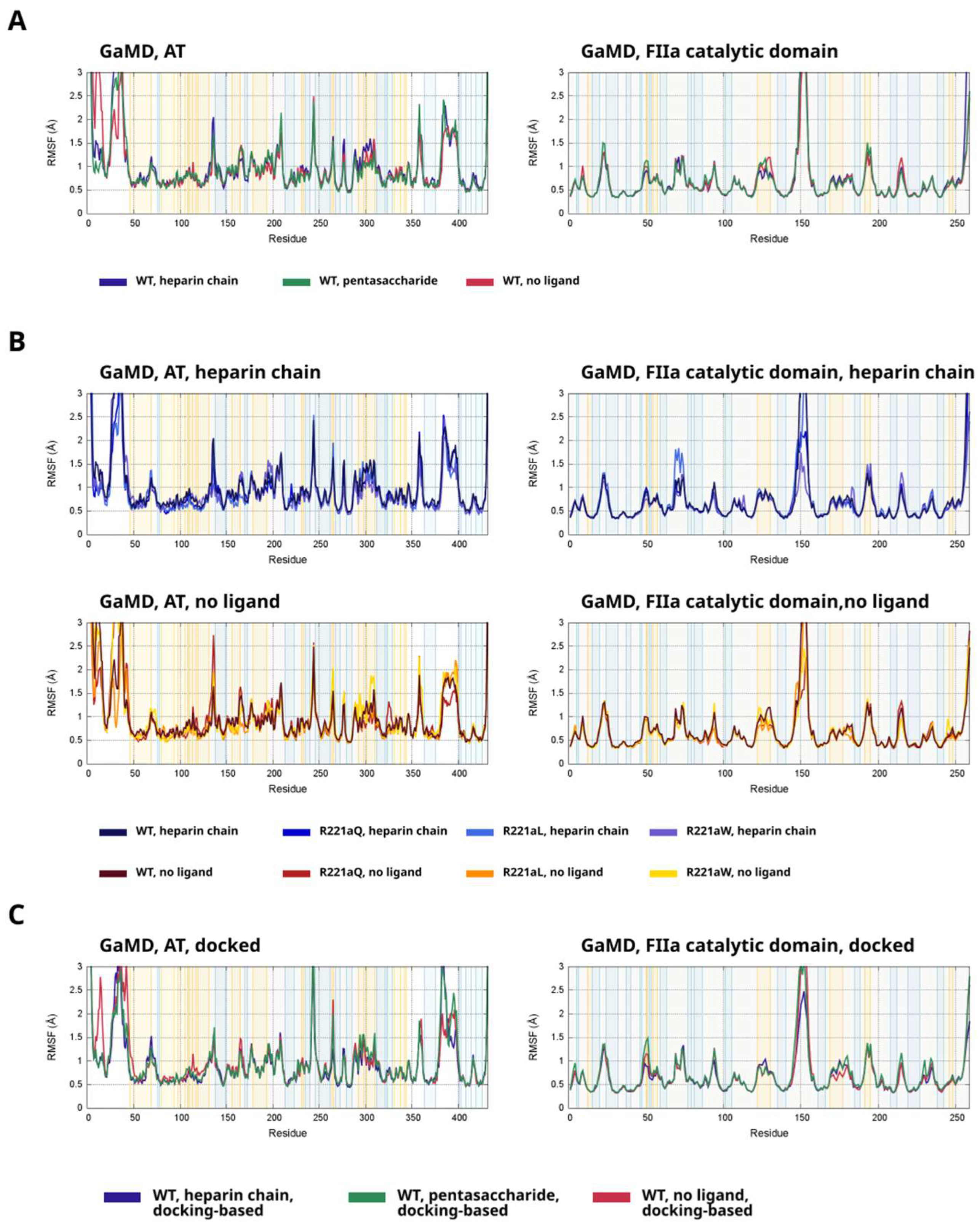 To assess the flexibility of important regions in the docking-based simulations and to investigate the consequences of heparinoid ligand binding, we performed RMSF analysis on the simulations based on the docked structure as well. We performed this analysis for both AT and thrombin. The results are presented on