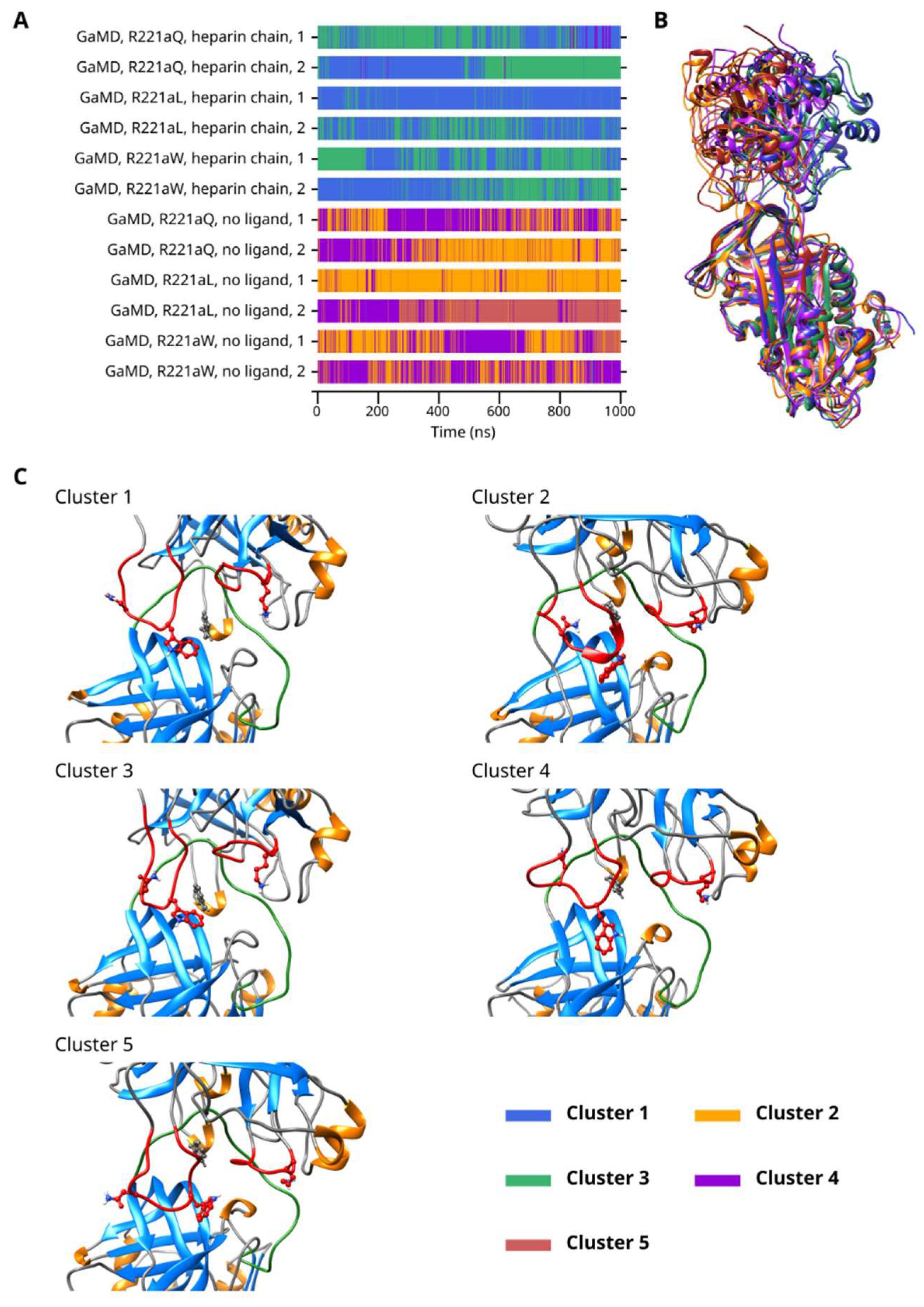 Figure 8) included all three mutants in both simulated activation states (a total of 12 simulations with the two replicas included in all cases.) There was significant difference between the behavior of the systems with a heparinoid or no ligand. Rapid conformational transitions were observed between Clusters 1 and 3 in the heparin-chain-containing simulations and between Clusters 2 and 4 in the simulations with no ligand. Cluster 5 was mainly present in the simulations of the R221aL and R221aW mutants without a ligand. Interestingly, conformations belonging to Cluster 4 were also observed in trajectories with a heparinoid molecule at a low frequency, mainly in the case of the R221aQ mutant.