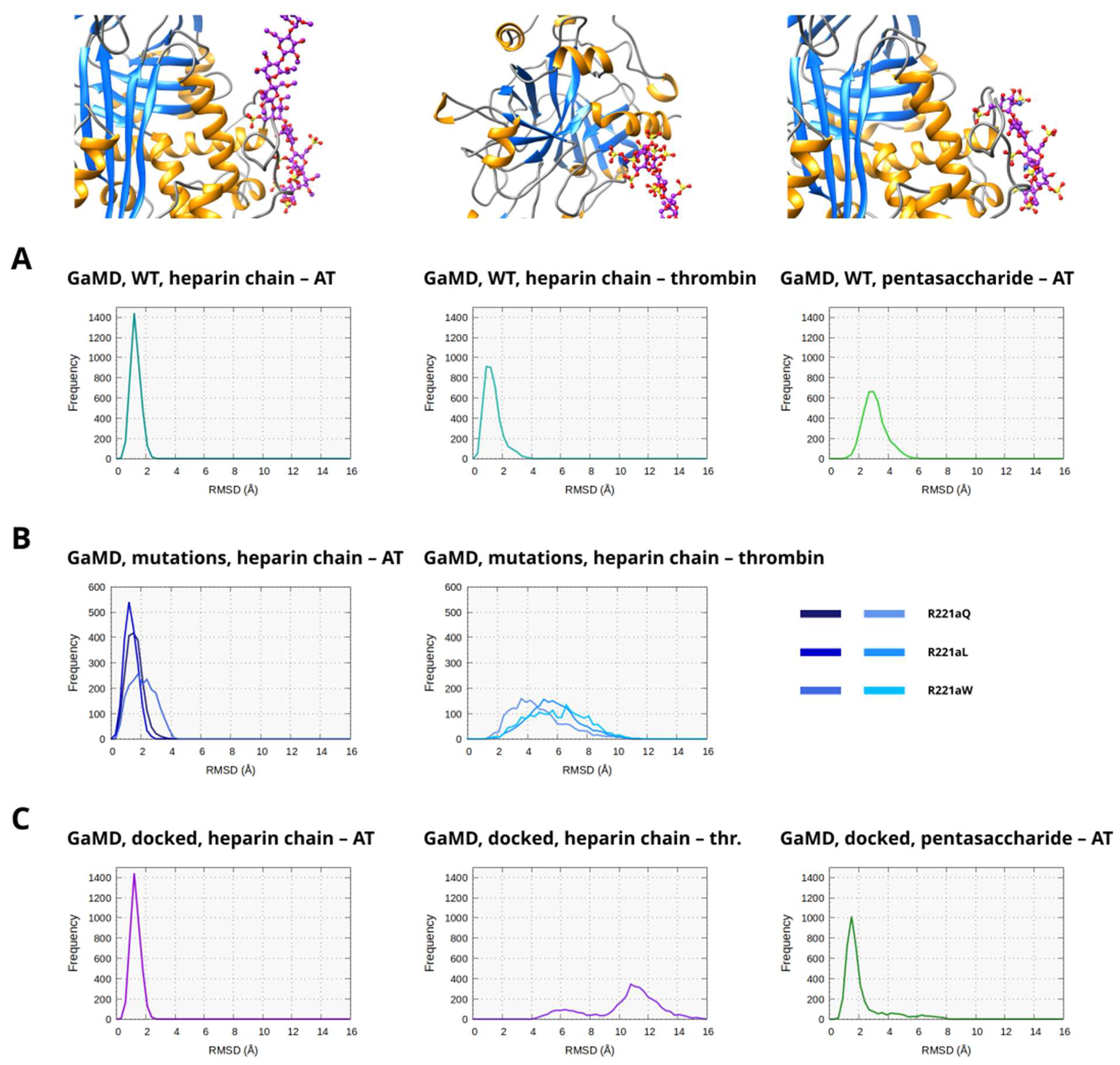 Figure S46), the interaction between the heparinoid and AT remained stable. However, the RMSD values in the R221aW system were somewhat higher. This can be explained by the significant movement of thrombin in these complexes compared to the X-ray structure, which probably results in some level of conformational strain at the other end of the molecule. In the analysis of the heparin chain binding to thrombin, we could detect increased RMSD values compared to the WT simulations. The values were typically higher in the simulations of the R221aW and R221aQ mutants compared to R221aL.