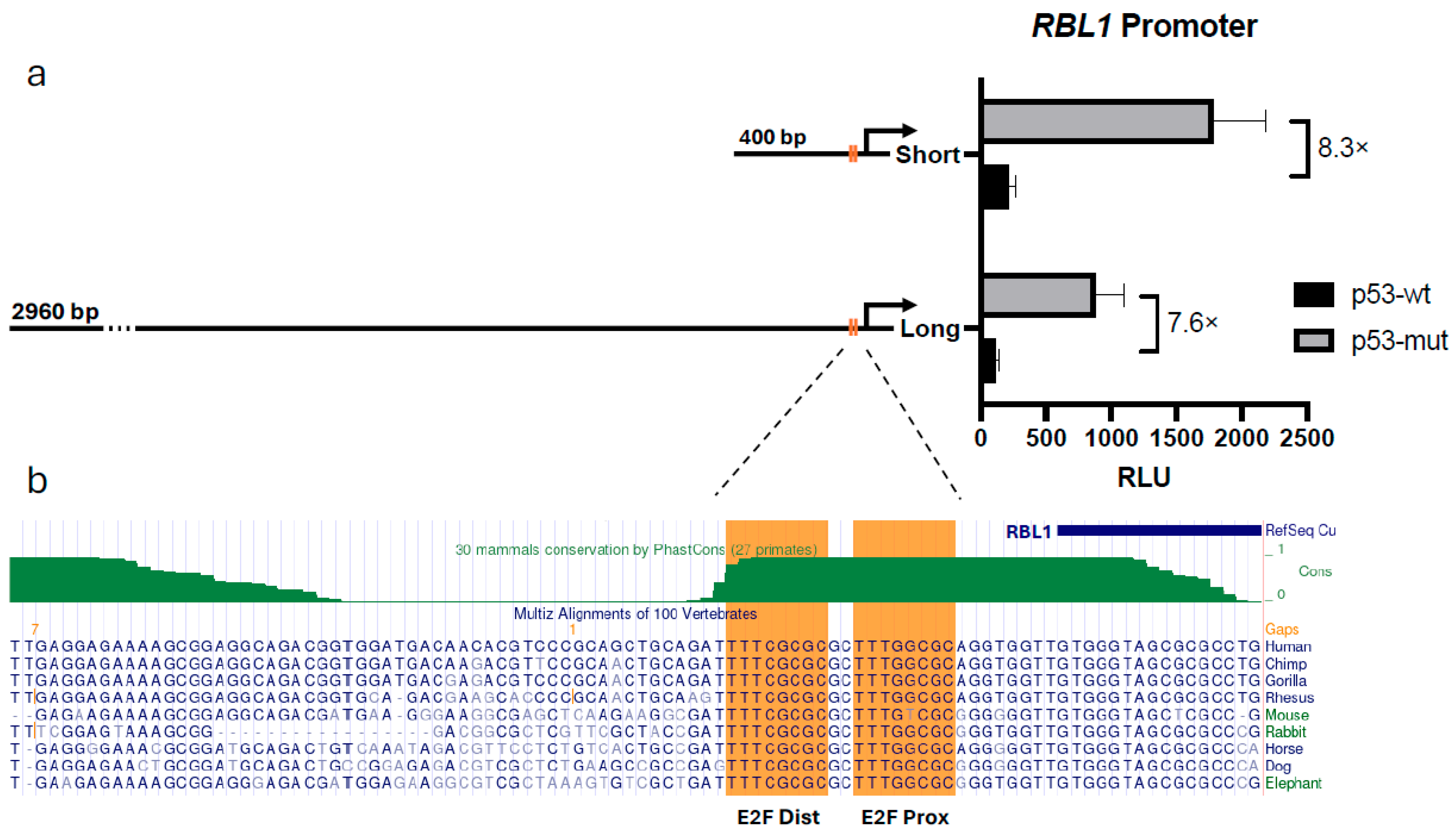 2.2. p53-Mediated Regulation of RBL1 Is Retained in a Short Promoter Fragment Containing Conserved E2F Sites