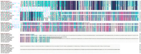 Amino acid sequence alignment for A. sapidissima hsp90b1 and other species. Different colors indicate the similarity of the amino acid sequences: black: 100%; pink: 70%; cyan: 50% and more; white: below 50%. The red dashed box indicates the hsp90b1 gene information for the A. sapidissima.