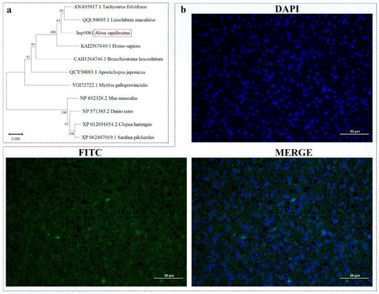 Analysis of the sequence features of the hsp90b1 gene in the A. sapidissima. (a) Phylogenetic tree of HSP90B1 amino acid sequence of A. sapidissima. (b) Results of in situ hybridization analysis of the hsp90b1 gene in A. sapidissima (×400, 50 μm), with nuclei stained with DAPI (blue) and hsp90b1 signals stained with FITC (green). The red box represents the A. sapidissima.