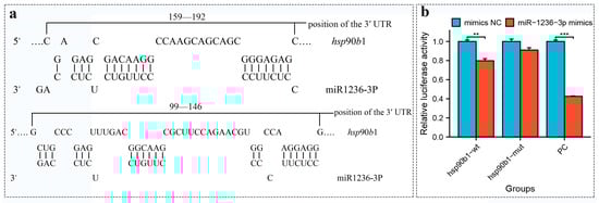 (a) Binding site analysis between hsp90b1 gene and miR-1236-3p. (b) Analysis of the target relationship of miR-1236-3p with hsp90b1 in HEK 293T cells using a dual luciferase reporter assay. Relative luciferase reporter expression was normalized to NC. Each treatment was repeated in triplicate. Data are presented as mean ± standard error. An asterisk (**) indicates p < 0.01 compared to the NC mimic, and “***” indicates p < 0.001.