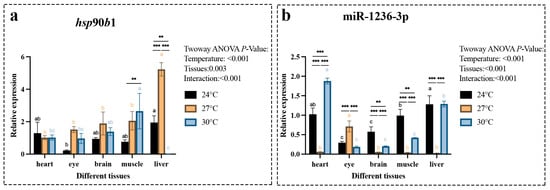 Expression level of the hsp90b1 gene (a) and miR-1236-3p (b) in different tissues of the A. sapidissima under various temperature conditions. All parameter values represent the mean ± standard error of three replicate groups. Different letters within the same color column indicate significant differences between tissues (p < 0.05); “**” indicates significant differences (p < 0.01) within the same group across different temperature conditions, while “***” indicates p < 0.001.