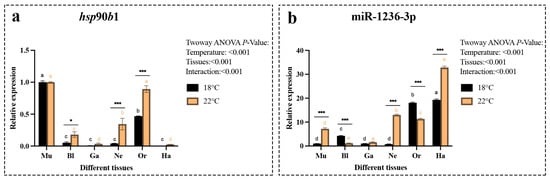 Expression level of the hsp90b1 gene (a) and miR-1236-3p (b) during different early developmental stages at 18 °C and 22 °C. All parameter values represent the mean ± standard error of three replicate groups. Different letters within the same color column indicate significant differences between developmental stages (p < 0.05); “*” denotes significant differences between temperature treatments at the same developmental stage (“*” means p < 0.05, “***” means p < 0.001). Multicellular stage (Mu), blastula stage (Bl), gastrula stage (Ga), neurula stage (Ne), organogenesis stage (Or) and hatching stage (Ha).