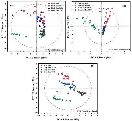 Scores plot obtained for the raw data for hair samples with HEs for (a) black hair, (b) bleached hair, and (c) gray hair.
