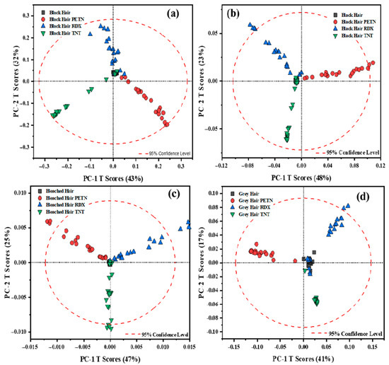 The MVA preliminarily allowed the detection and discrimination of HEs from 300 to 2000 cm−1. This chosen range aligns with the vibrational peaks of nitro groups, particularly between 1200 cm−1 and 1400 cm−1. A PCA model was created for black, bleached, and gray hair as an exploratory tool for the acquired data. However, the raw PCA models did not provide enough information regarding separating the explosives, PETN and RDX, on black and bleached hair. TNT was fully separated on the raw score plot since the vibration of the NO2 is from an aromatic compound, and this peak is presented in a relatively wide band.