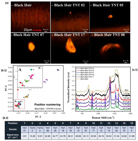 Distribution of Black Hair with TNT deposition. (a) Gray light micrograph of strands of black hair, along with (a.1) RS spectra showing the approximate diameter of each TNT crystal. In addition to the prominent -NO2 peak at 1369 cm−1, the spectral region between 750 and 1000 cm−1 shows intensity variations corresponding to additional TNT markers. These bands contribute to the chemical fingerprint used for explosive identification and are relevant for PCA-based clustering. (b.1) Score plot for black hair pre-processed with the first derivative, annotated using positional numbering radiating from the center. (b.2) Table emphasizing the grouping and direction of TNT samples with their respective signal area from the primary nitro group vibration (1369 cm−1) on the HE.