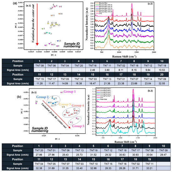 The distribution on the score plot was also analyzed for bleached hair samples, observing the same trend as for black hair, as seen in Figure 4a. Based on the evaluation of multiple RS spectra from bleached hair, as shown in Figure 4(a.2), we observed that the variance radiating outward from the center of the score plot is closely associated with the intensity of the nitro group peaks, as also shown in the black hair variations. This relationship contributes to the formation of line cluster distributions across the score plots for each hair sample. Unlike Figure 3(b.1), which uses positional numbering radiating from the center of the score plot, Figure 4(a.1,b.1) display sample identifiers (“Sample ID numbering”) directly on the score plots. It is important to note that this approach was chosen because multiple samples were located within overlapping areas, making consistent positional numbering impractical. The distribution depicted in the score plot is mainly due to the nitro group’s main peak on TNT (1369 cm−1), which will be explained in more detail later in the discussion. The evaluation was made for TNT, but the same variation occurred with aliphatic explosives, PETN, and RDX. For samples 8, 6, 4, and 20 for bleached hair-TNT, it was impossible to indicate the area from the -NO2 vibration (using the Origin Pro™ 2020 software), but still, the model recognized that those samples belong to this cluster. The diameter of the TNT crystals for samples 8, 6, 4, and 20 for bleached hair was not acquired due to small crystals, and the -NO2 vibration peak was masked by the bleached hair vibrational contribution. This is why it is efficient to use MVA methods since they detect even the most minor changes/variations in the spectral data.