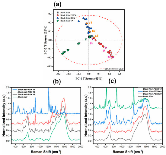 Distribution of Black Hair with RDX and TNT deposition. (a) Score plot for black hair pre-processed with the first derivative, with labeling (b) RS spectra comparison for score plot variation for RDX. (c) RS spectra comparison for score plot variation for PETN.