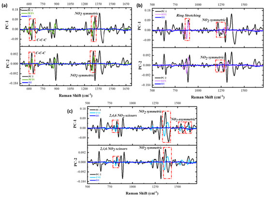 The vibrational signals from each HE can be evaluated using the obtained loading plots to fully corroborate that the variation being analyzed is the one from each of the vibrations of the nitro groups. The RS spectral region from 311 to 1750 cm−1 was used to investigate these possible variations. This spectral region was selected because most of the variation for the model was situated here. The loading plot obtained for the PCA model for black hair was evaluated to identify variation in areas from the spectral data. The loadings presented are from the pre-treated data using the first derivative. Figure 6 represents the loadings plot variation for the first two PCs of the model in comparison with each of the HEs of interest. When a first derivative is applied, each of the vibrations is located at the intersection of the x-axis. The main variations occur in the vibrational signals from each of the explosives. The results from these vibrations are presented in Table 2, and Figure 7 provides the spectra for each of the HEs under study and each of the hair types for reference. The data in this table shows the absolute and relative error from each HE, representing minor differences when comparing it to the acquired spectra. For PETN variations, one variation occurred at 1302 cm−1 with a relative error of 0.85%, RDX variation is situated at 1278 cm−1 with a relative error of 0.24%, and for TNT, a substantial variation on the loadings plots on 1375 cm−1 with a relative error of 0.95%. All these variations are attributed to the -NO2 group in each explosive.