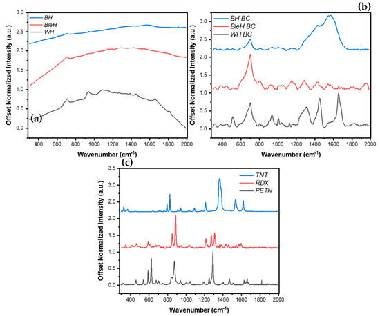 Corresponding RS spectra for hair samples (a) before and (b) after baseline correction (BC) in the spectral range of 200cm−1 to 2000cm−1. (c) RS spectra of HE (TNT, RDX, PETN) in the spectral range of 200cm−1 to 2000cm−1. The raw spectra illustrate the fluorescence background and characteristic vibrational peaks of each hair sample, while the corrected spectra highlight the distinct signature peaks used for PCA-based classification. This comparison demonstrates the effectiveness of baseline correction in enhancing spectral clarity and facilitating discrimination between explosive types on different hair substrates.
