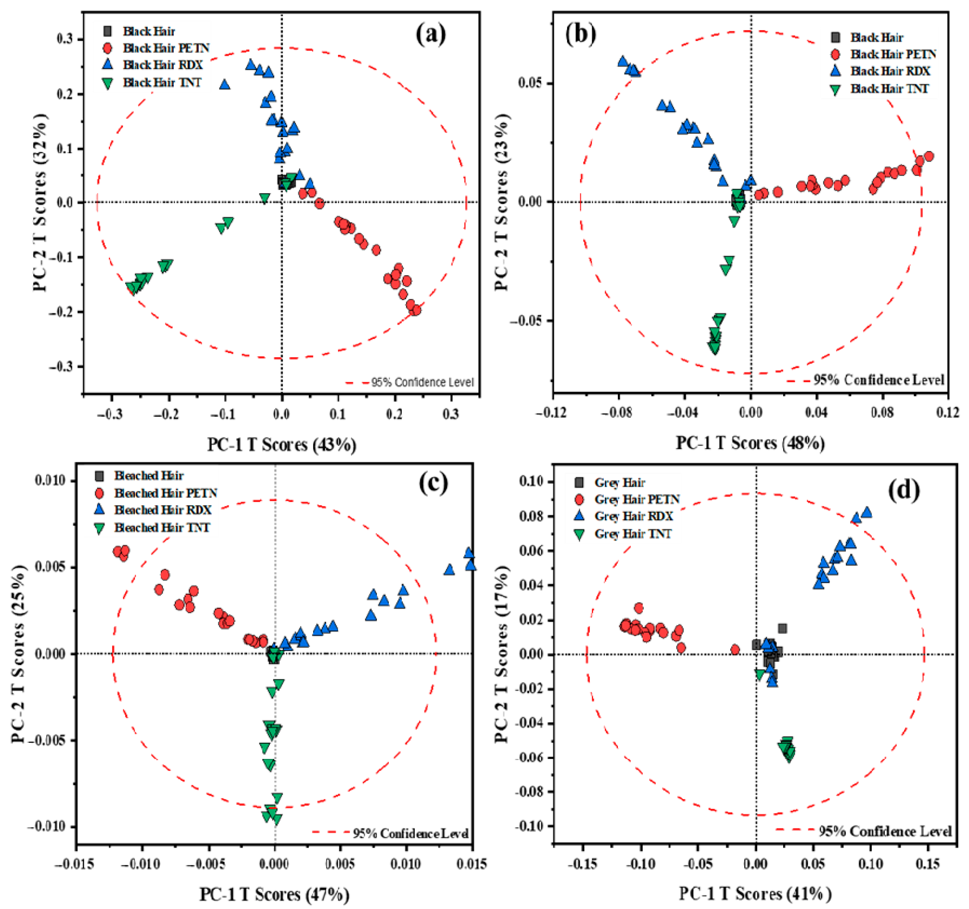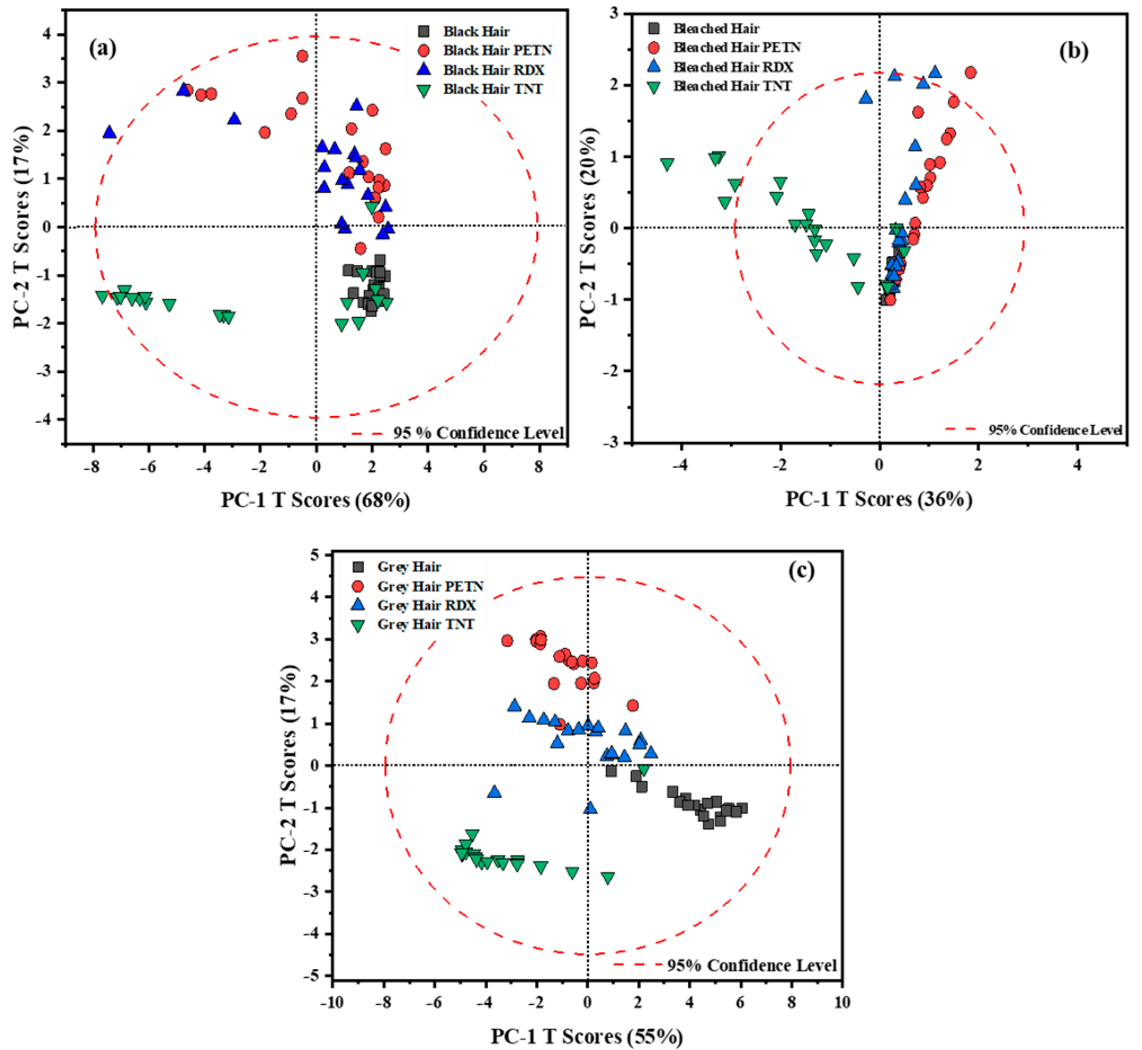 PCA was used as an exploratory tool to qualitatively identify possible information between traces of explosives on human hair. After the spectral data were characterized, PCA models for black, bleached, and gray hair were generated. Score plots based on PCA models were developed. The first score plot for each type of hair sample is shown in