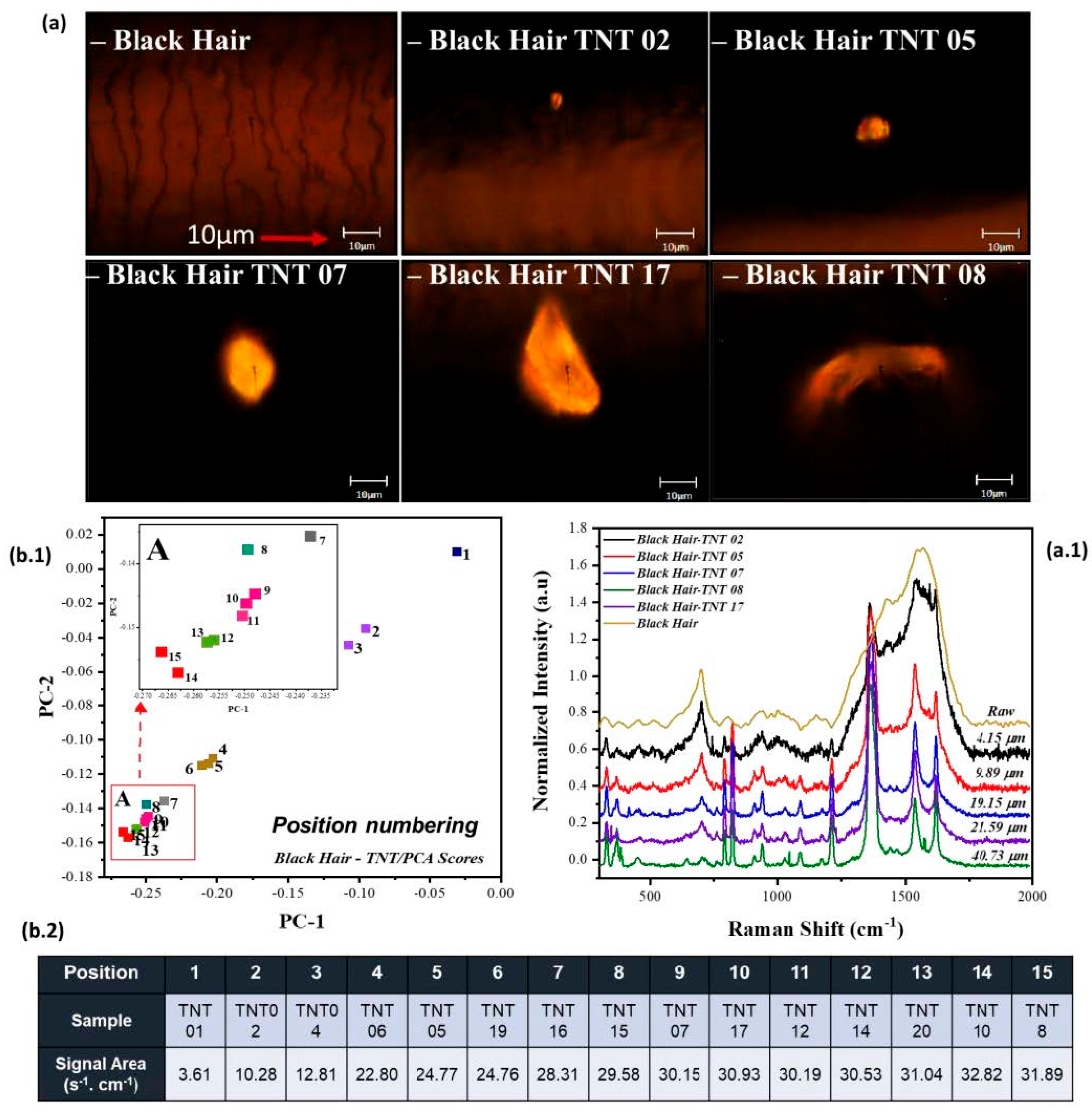 Figure 3b.1 illustrates the score plot distribution in line cluster for Black Hair-TNT samples, indicating the spatial arrangement of each sample radiating outward from the center of the PCA score plot. The approximate diameter of each crystal was acquired by approximating pixels on the image and converting them to micrometers using the scale on each of the gray light micrographs. The diameter of the laser spot was approximately 1.1 μm (50× Ultra-Long Working Distance, ULWD) Olympus™ objective (Olympus Corporation, Tokyo, Japan). (see