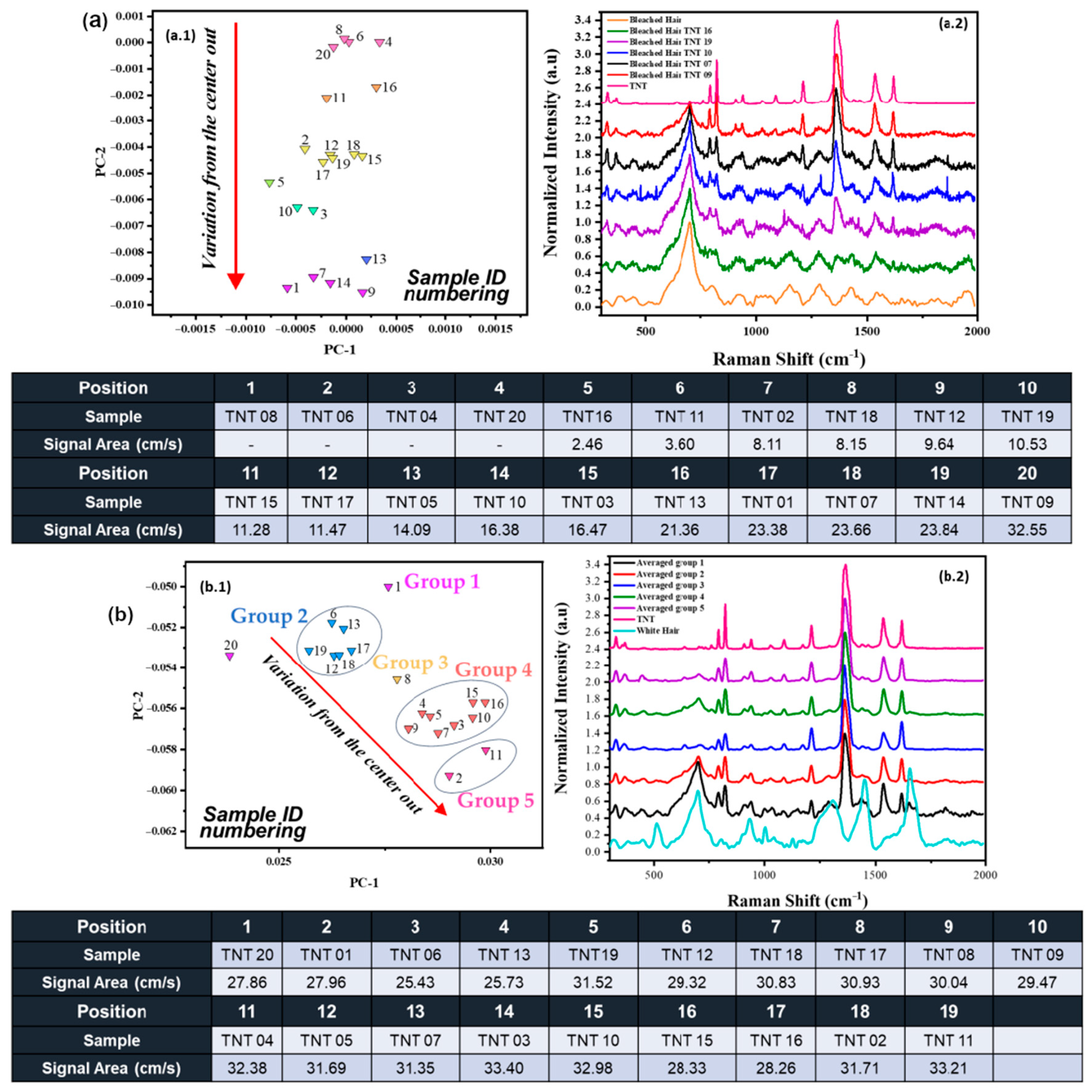 Figure 4a.1,b.1 display sample identifiers (“Sample ID numbering”) directly on the score plots. It is important to note that this approach was chosen because multiple samples were located within overlapping areas, making consistent positional numbering impractical. The distribution depicted in the score plot is mainly due to the nitro group’s main peak on TNT (1369 cm