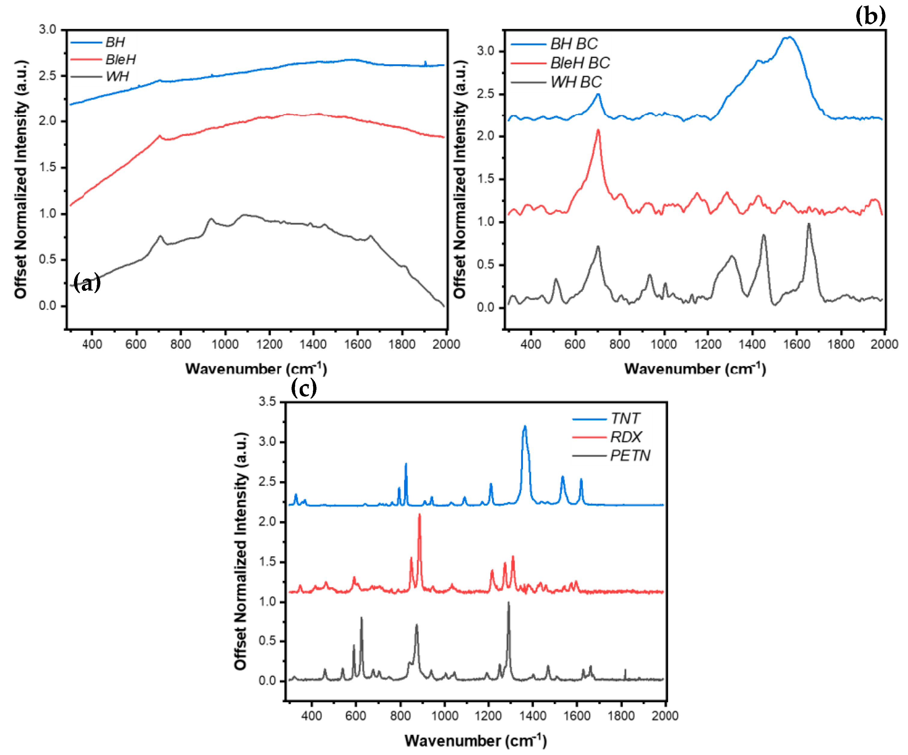 Previous studies have demonstrated the potential of RS combined with chemometric tools for the detection and differentiation of explosives on diverse substrates. For instance, RS detection of TNT, RDX, and PETN has been reported on metals, soils, fabrics, and reflective surfaces, showing characteristic nitro group vibrations that allow classification. [