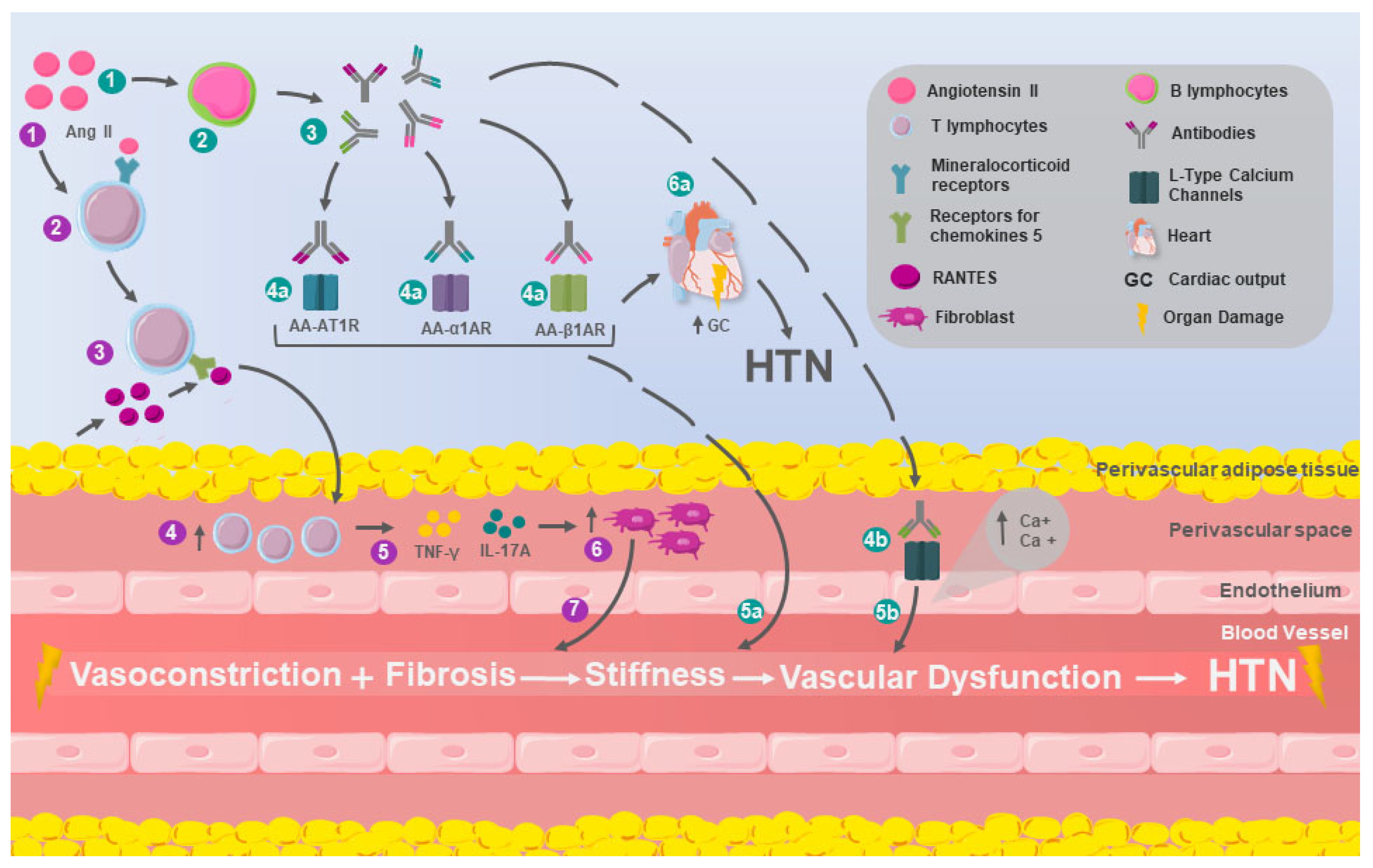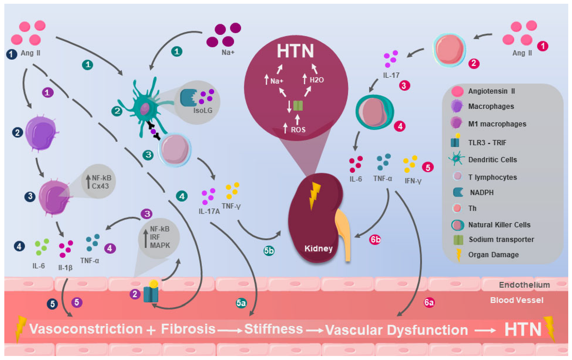 - Nguyen, B.A.; Alexander, M.R.; Harrison, D.G. Immune Mechanisms in the Pathophysiology of Hypertension. Nat. Rev. Nephrol. 2024, 20, 530–540. [Google Scholar] [CrossRef]