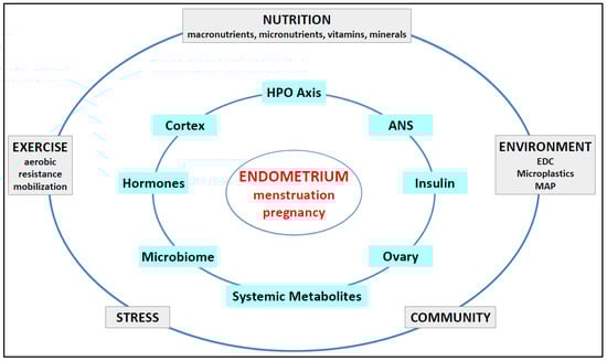 The human endometrium is the functional tissue that interacts with the embryo from the next generation to ensure implantation, appropriate feto-placental development and growth, and species survival [,,]. Female metabolism and endocrine physiology are intimately connected by reciprocal feedback mechanisms that ensure reproduction is coordinated with optimal metabolic health [,]. Cyclical stimulation of endometrial epithelial, stromal, glandular, and muscular tissues by ovarian-derived sex steroids and locally produced paracrine hormones, cytokines, chemokines, exosomes, and other communication molecules operates best when female physiology and metabolism are optimized. Lifestyle factors such as a healthy diet and exercise are recommended for first-line treatment of PCOS in the international guidelines to optimize physiology; metabolism; and, ultimately, molecular function in the endometrium (see Figure 1).