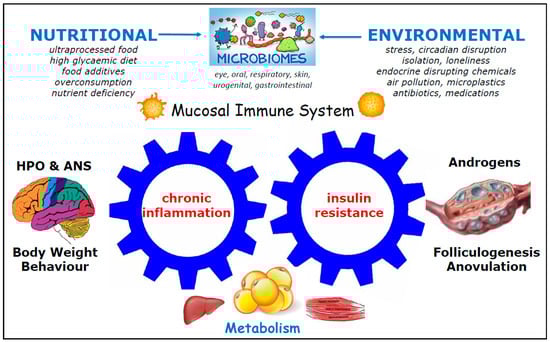 The mucosal immune system and the human MB form an interconnected network that spans the entire body []. Each mucosal interface has its own unique MB—which refers to the entire habitat of microorganisms, including the genome and surrounding environmental conditions—and microbiota (collection of microorganisms) []. The mucosal immune system and MB act as an adaptive interface between the host and the environment, constantly recalibrating to maintain health []. Disruptions in this symbiosis, through diet, environmental influences (e.g., EDCs, microparticulate air pollution, or microplastics), infection, or antibiotics, can trigger mucosal immune dysregulation and contribute to a range of local and systemic conditions, such as infertility, pregnancy complications, and PCOS [,,,]. In addition, disturbances in the MB at one mucosal site can contribute to IR, CSI, and hormonal imbalance, which have pathological influences in apparently unrelated tissues and organs, such as the ovaries and endometrium (see Section 4.8).