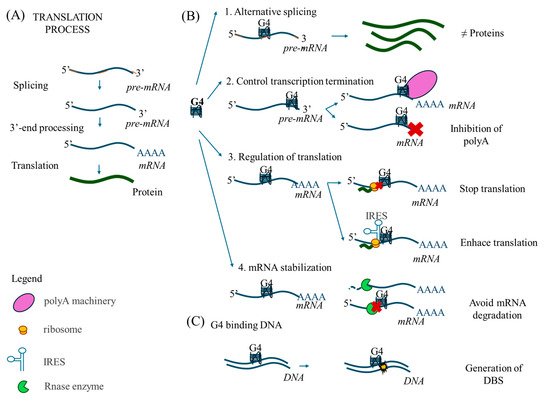 G-quadruplexes (G4s) are non-canonical DNA or RNA structures formed by tetrads of guanines bonded by Hoogsteen hydrogen bridges. G4s can regulate gene expression by increasing mRNA stability, inducing alternative splicing, influencing transcription termination by controlling 3′-end processing, and by regulating the final step of mRNA translation [1,2,3] (Figure 1). Generally, G4s stop translation by preventing ribosome binding to the mRNA, but when G4s are located upstream the internal ribosome entry site (IRES), they act oppositely and enhance translation [4]. Specifically, G4 structures can modulate gene expression in cancer [5,6,7,8]. G4 structures can also interfere with DNA replication and repair, leading to increased DNA damage and replication stress [9].