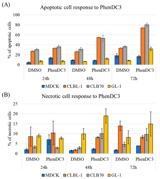 Next, cells were treated with DMSO or 5 µM of PhenDC3 for 24, 48, and 72 h to analyze patterns of observed cytotoxicity. The basal level of apoptosis in MDCK cells was relatively low, and PhenDC3 treatment induced little, if any, increase in the percentage of apoptotic cells compared to DMSO control at any time point (Figure 2A, blue). In the case of CLBL-1 and CLB70 cell lines, the pattern was very different. Here, around 25% of cells were apoptotic when treated with DMSO alone. The percentage of apoptotic cells increased to 30%, 50%, and 80% after PhenDC3 treatment for 24, 48, and 72 h, respectively, in both CLBL-1 and CLB70 cell lines (Figure 2A, orange and gray). The GL-1 cell line was more resistant to apoptosis compared to CLBL-1 and CLB70, showing an increase of up to 30% of apoptotic cells only after 72 h of treatment with PhenDC3 (Figure 2A, yellow). The percentage of necrotic cells showed greater variability among the four cell lines tested; for MDCK, only a few necrotic cells were detected (Figure 2B, blue). In CLBL-1, approximately 10% of cells were necrotic in both DMSO and PhenDC3 conditions after 24 h, increasing to 20% after 48 h in the cells treated with PhenDC3, and interestingly, decreasing to 15% after 72 h of PhenDC3 treatment (Figure 2B, orange). In CLB70, a slight increase to 10% of necrotic cells after PhenDC3 treatment for 48 and 72 h was noticed (Figure 2B, gray). Finally, whereas the GL-1 cell line was more resistant to PhenDC3-induced apoptosis, both the basal and induced levels of necrosis were substantially higher at 48 h than in the other cell lines (Figure 2B, yellow).
