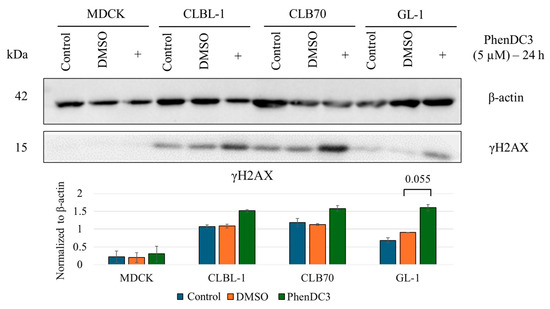 PhenDC3 is known to induce ssDNA lesions [22]. A marked increase in the γH2AX signal was observed following treatment with higher concentrations of PhenDC3 (10 or 30 μM) for 24 h (Figure S1). Treatment with 5 μM for 24 h resulted in a slight increase in γH2AX levels compared to untreated or control cells (Figure 3), although this difference did not reach statistical significance.
