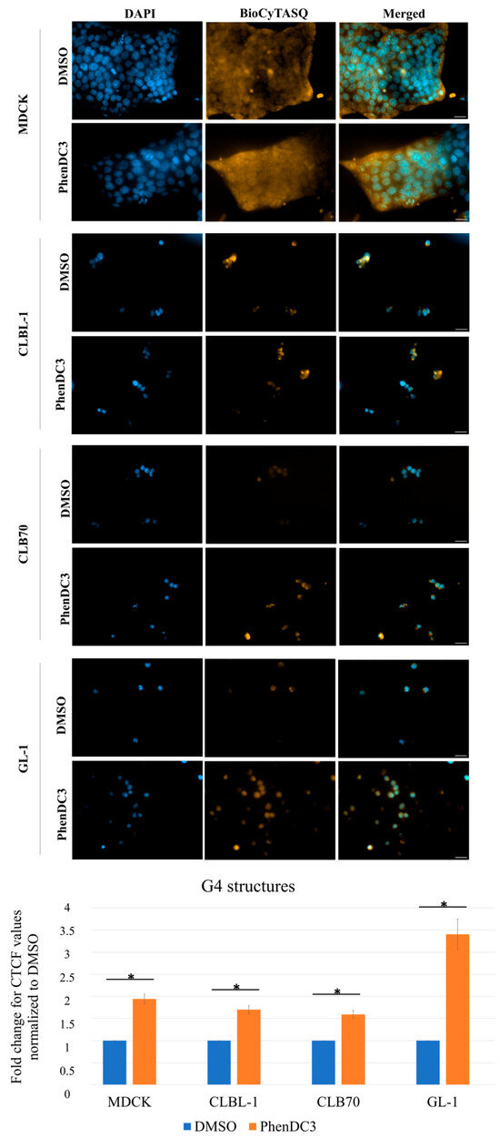 A total of 0.5 × 106 MDCK cells, 1 × 106 GL-1 cells, and 1.5 × 106 CLB70 and CLBL-1 cells were cultured in 6-well plates (Thermo Fisher Scientific, Roskilde, Denmark) and were treated with DMSO or PhenDC3 at a 5 µM concentration for 24 h. Cells were treated with the BioTracker™ BioCyTASQ G-quadruplex (G4) cell probe (Sigma Aldrich, Steinheim, Germany) at a concentration of 1 μM under dark conditions to enable the detection of G4s. After 24 h, cells were washed in PBS once and fixed in cold MeOH for 10 min. Cells were washed with PBS and subsequently incubated in a blocking solution of 1% BSA in PBS for 30 min at room temperature. To visualize BioCyTASQ under the microscope, cells were incubated with Molecular Probes™ Streptavidin–Cy3 (Sigma Aldrich, Steinheim, Germany) diluted 1:1500 in blocking solution for 1 h. Cells were washed with PBS before and after staining with DAPI (Sigma Aldrich, Steinheim, Germany) for 15 min. Cells were washed in PBS twice and then kept in PBS. For observation, 100 µL of cells were added to a well in a 96-well plate. When cells were at the bottom of the well, images were acquired using the inversed microscope Zeiss Axio Observer 7 (Jena, Germany) with a ×40 magnification. Image analysis was performed using FIJI software [47], the results are the mean of 3 independent experiments (5 measurements each condition). A t-test was performed comparing intensity measurements of the PhenDC3 condition normalized to DMSO to show statistical significance.