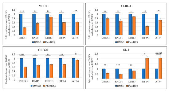 Fold change enrichment of the mRNA expression levels comparing DMSO to 5 µM PhenDC3 treatments in all tested cell lines. qPCR results showed that expression of DDR genes CHEK1 and RAD51 decreased after treatment with PhenDC3 when compared to DMSO. The UPR genes showed more variable results. The expression of the DDIT3 gene tends to decrease in the four cell lines tested, but EIF2A and ATF4 decreased in MDCK, CLBL-1, and CLB70, but increased in the GL-1 cell line. Results from three independent experiments. Significant p-values are represented with asterisk: ≤0.05 (*), ≤0.01 (**), ≤0.001 (***), ≤0.0001 (****). Non-significant p-values > 0.05 are represented as ns.