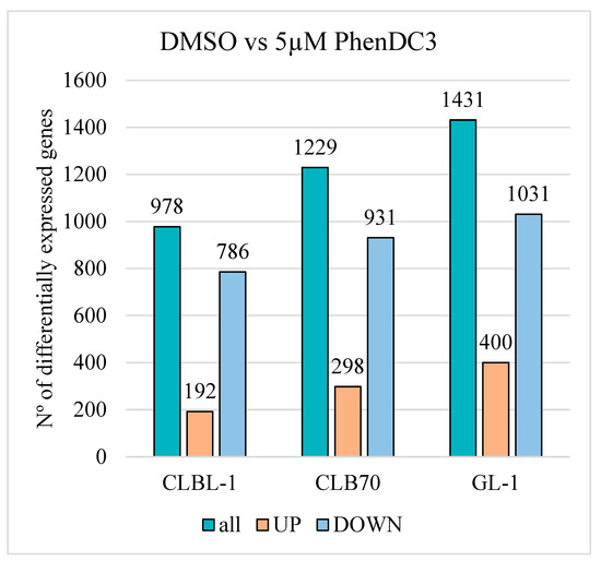 All three cell lines presented the same pattern, with more downregulated than upregulated genes in the samples treated with PhenDC3 than in the DMSO group (Figure 6). In the CLBL-1 cell line, of the 978 genes expressed, 786 were downregulated and 192 upregulated. In CLB70, a total of 1229 genes were analyzed, of which 931 were downregulated and 298 were upregulated. In the GL-1 cell line, a total of 1431 genes were significantly expressed, 1031 were downregulated, and 400 were upregulated when comparing PhenDC3 treatment to DMSO.