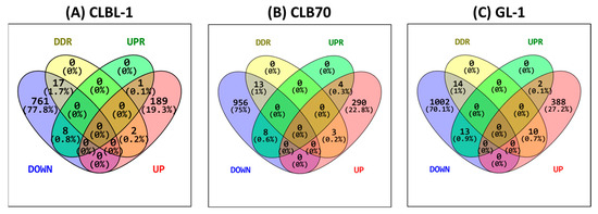 Venn diagrams representing the percentage of down- (blue) and up- (red) regulated genes of DDR- (yellow) and UPR- (green) related genes in the three different cell lines (A) CLBL-1, (B) CLB70, and (C) GL-1. Venn diagrams were prepared using the Venny tool [25]. Results from three replicates from independent experiments.