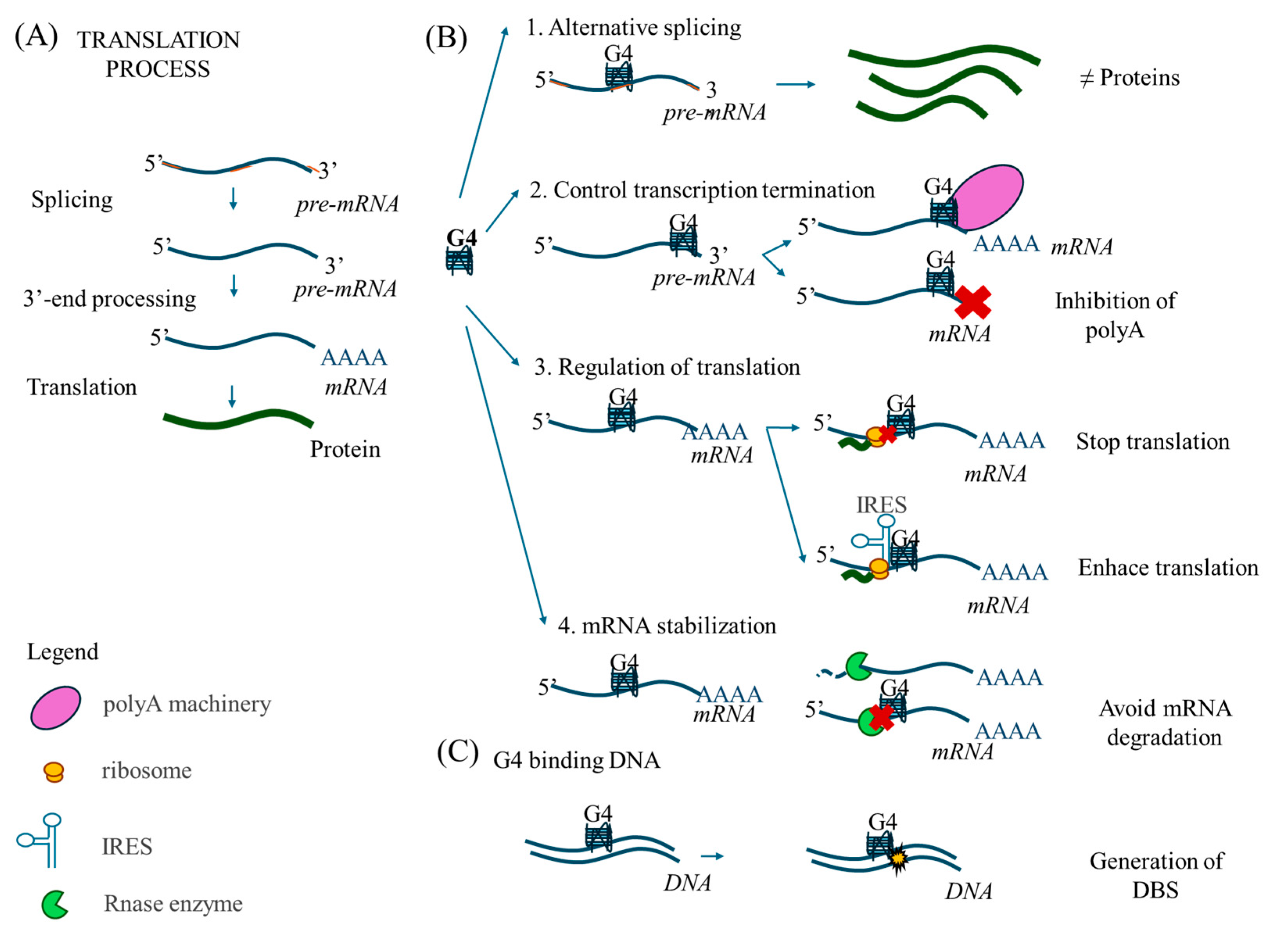 - Dumas, L.; Herviou, P.; Dassi, E.; Cammas, A.; Millevoi, S. G-Quadruplexes in RNA Biology: Recent Advances and Future Directions. Trends Biochem. Sci. 2021, 46, 270–283. [Google Scholar] [CrossRef]