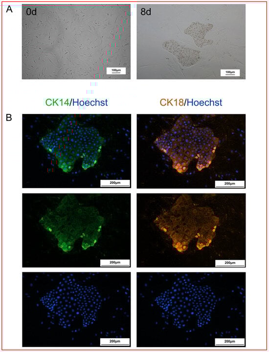 Fibroblasts were transformed into CiMECs via RepSox treatment: (A). Morphological changes in the cells during the induction process (day 0 to day 8). Scale bar, 100 μm. (B). Immunofluorescence staining of CiMEC-specific markers (CK14 and CK18). Scale bar, 200 μm.