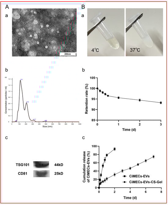 Identification of CiMECs-EVs and characterization of CMECG: (A). TEM, NTA, and WB identification of CiMECs-EVs. (a). TEM identification of CiMECs-EVs; (b). NTA identification of CiMECs-EVs; (c). WB identification of CiMECs-EVs. (B). Temperature sensitivity of CMECG and the retention and release effects of CiMECs-EVs: (a). state of CMECG at 4 °C and 37 °C; (b). retention effect of CMECG on CiMECs-EVs; (c). release effect of CMECG on CiMECs-EVs.
