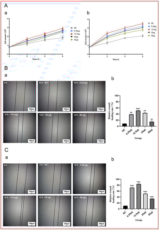 We evaluated the effect of CMECG on the proliferation of fibroblasts/MECs via the cell counting method and compared the effects of CMECG with different concentrations of CiMECs-EVs on the proliferation of fibroblasts/MECs. The results revealed that the proliferation rate of fibroblasts/MECs in the CMECG group with different contents of CiMECs-EVs was significantly faster than that in the hydrogel control group (NC group) over the same period, and the CMECG group containing 12.5 μg CiMECs-EVs had the fastest proliferation rate (Figure 3A(a,b)). In summary, the above experimental results showed that CMECG could significantly promote the proliferation of fibroblasts/MECs.